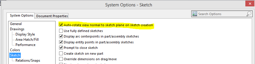 - Nya skisser gör man hela tiden och nästan jämt vill man ha sitt skissplan “rakt framifrån”. Detta gör SOLIDWORKS åt dig om “Options – System Options – Sketch – Auto-rotate view normal to sketch plane on sketch creation” är ibockad. Om du råkar vrida bort dig så är det bara att markera ytan och göra ctrl + 8…