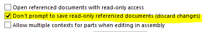 - För alla de som kör någon typ av PDM-system (spelar faktiskt mindre roll vilket, denna är aktuell för samtliga) så är inställningen: “Options – System Options – External References – Don’t prompt to save read-only documents (discard changes)” absolut livsnödvändig. Annars är det stor risk att man blir galen på alla “Save As…”-rutor som kommer upp om man råkar pilla på skrivskyddade filer.