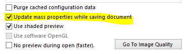 - En inställning som jag gillar är “Options – System Options – Performance – Update mass properties while saving document”. Bocka i den och vikten kommer att hållas uppdaterad. Om du hanterar superstora sammanställningar och ändrar på många filer åt gången kan denna inställning göra att det tar lite längre tid att spara. För alla oss andra funkar det bra att ha denna ibockad.