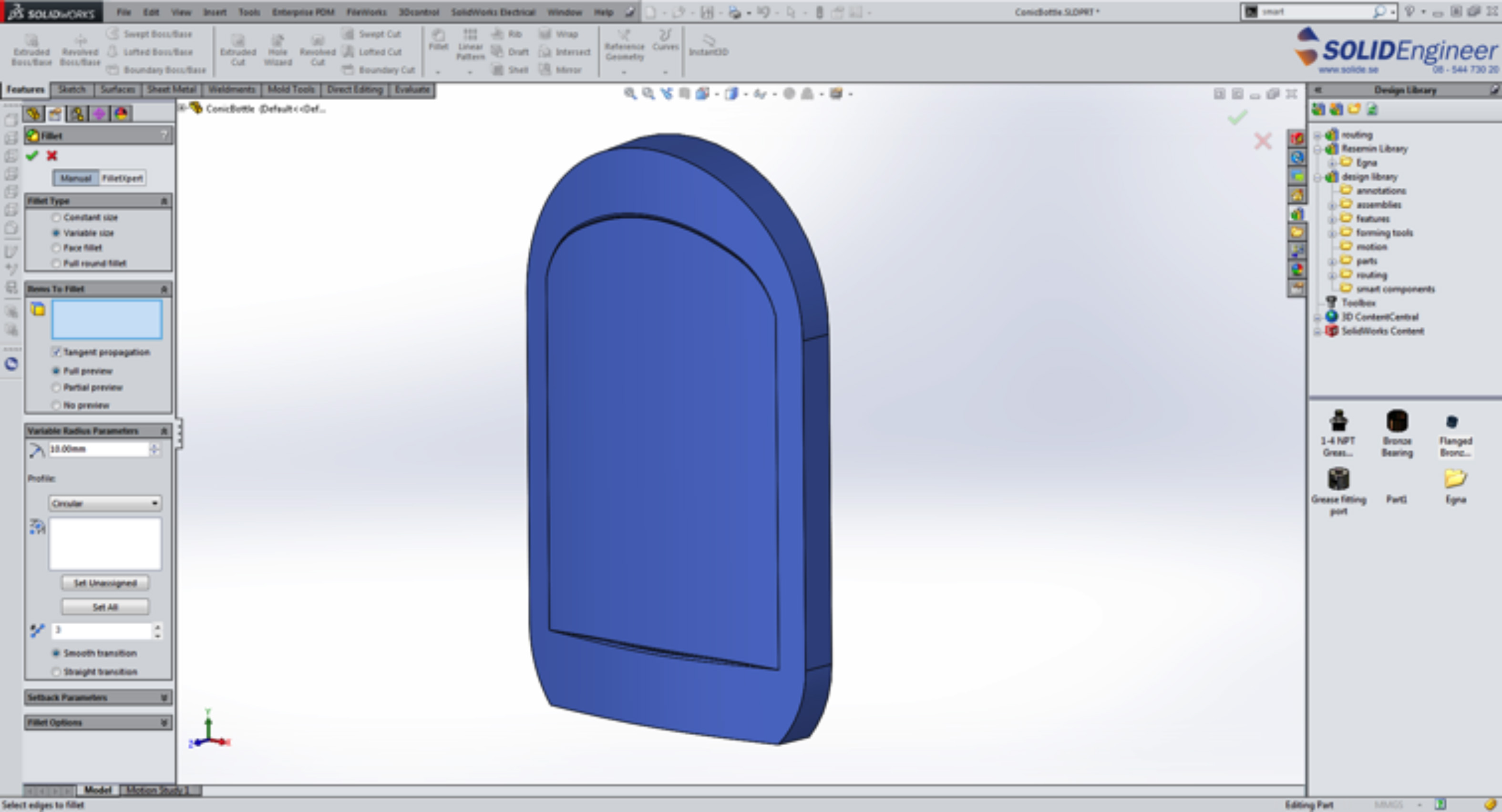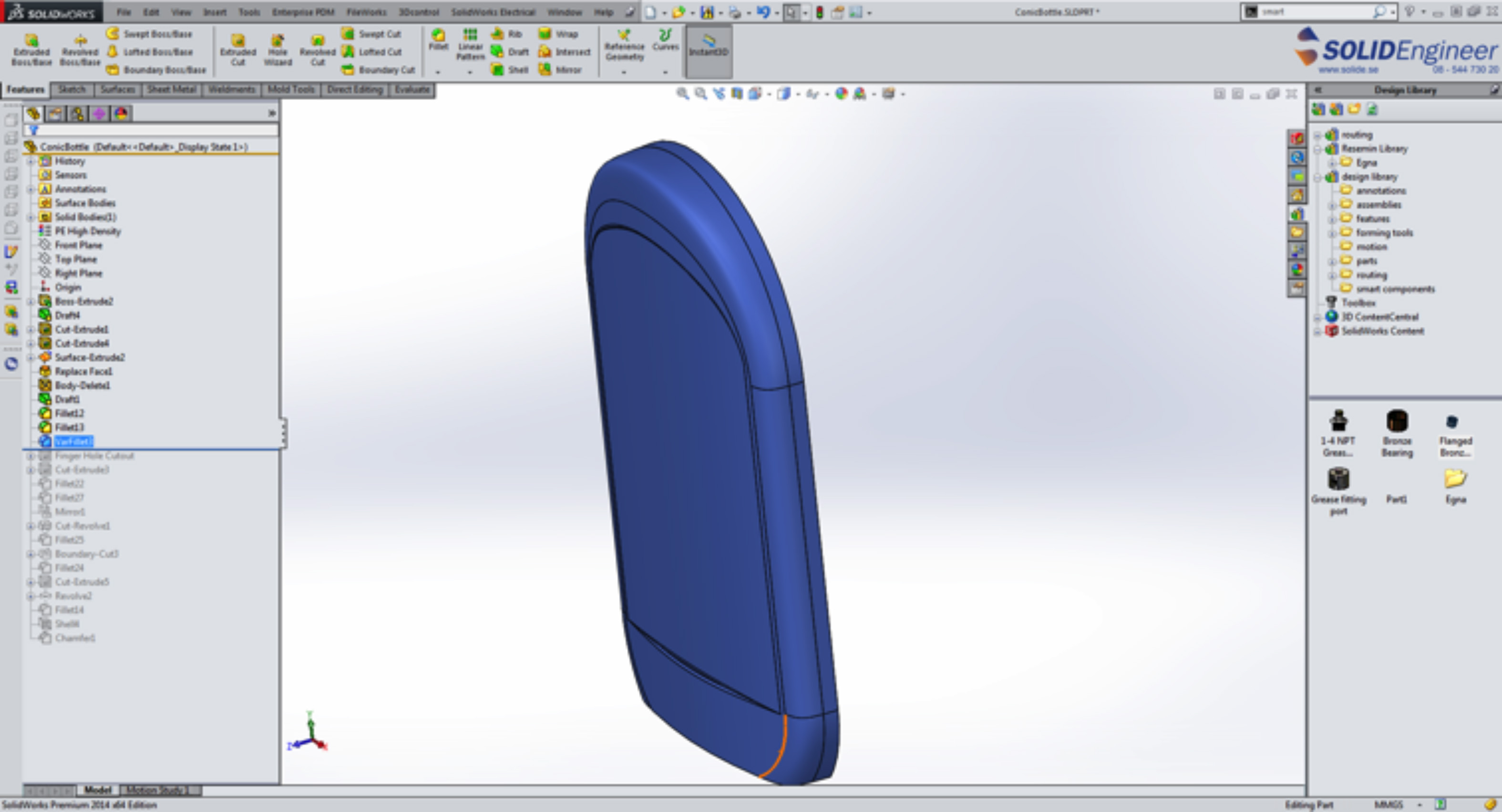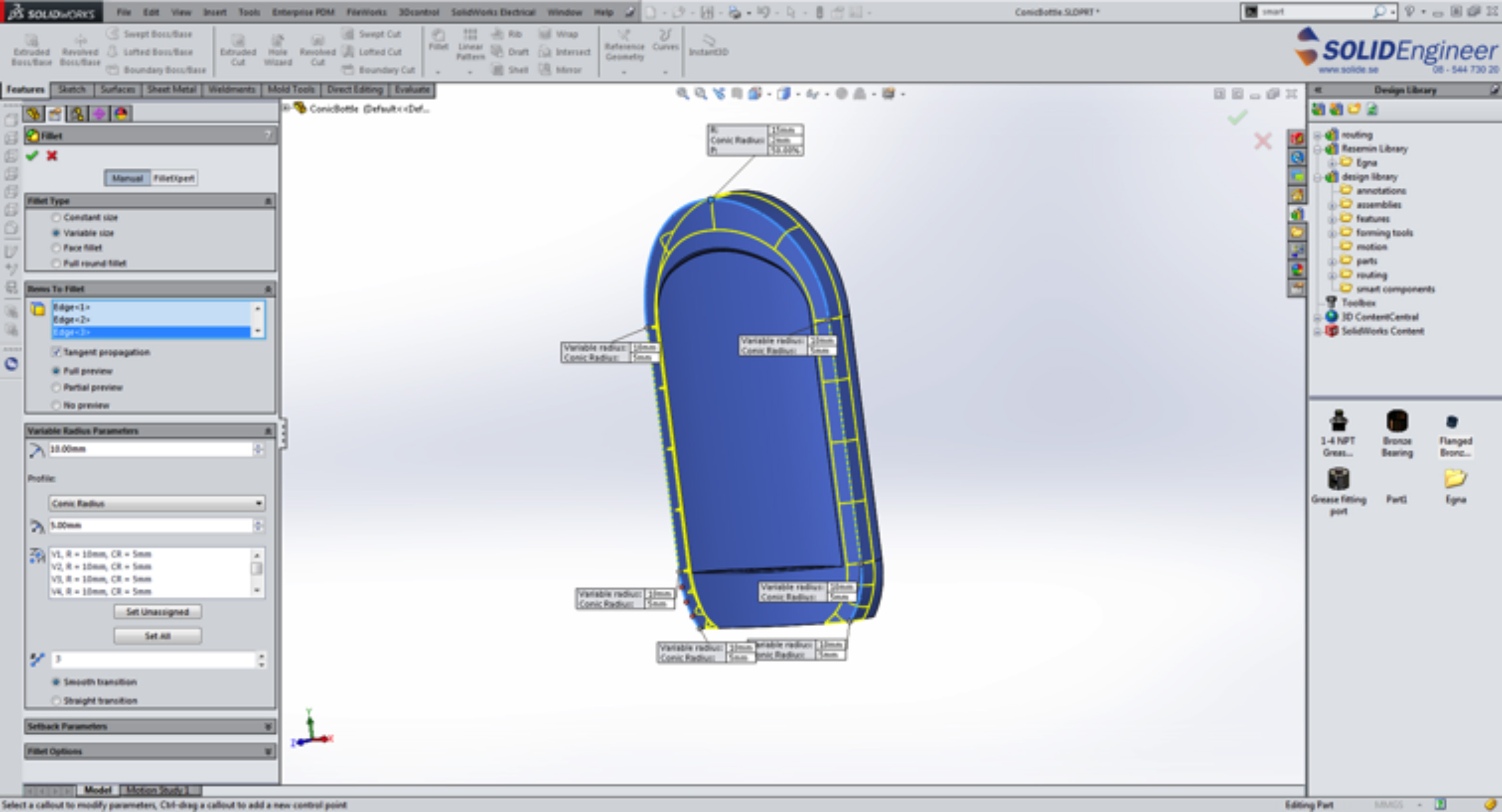 Med det i 2014 nya verktyget conic fillet kan man få till riktigt avancerade och snýgga radieövergångar på sina detaljer. Tillsammans med variable fillet så har man möjlighet att få till önskade övergångar utan att behöva använda ytmodulering.