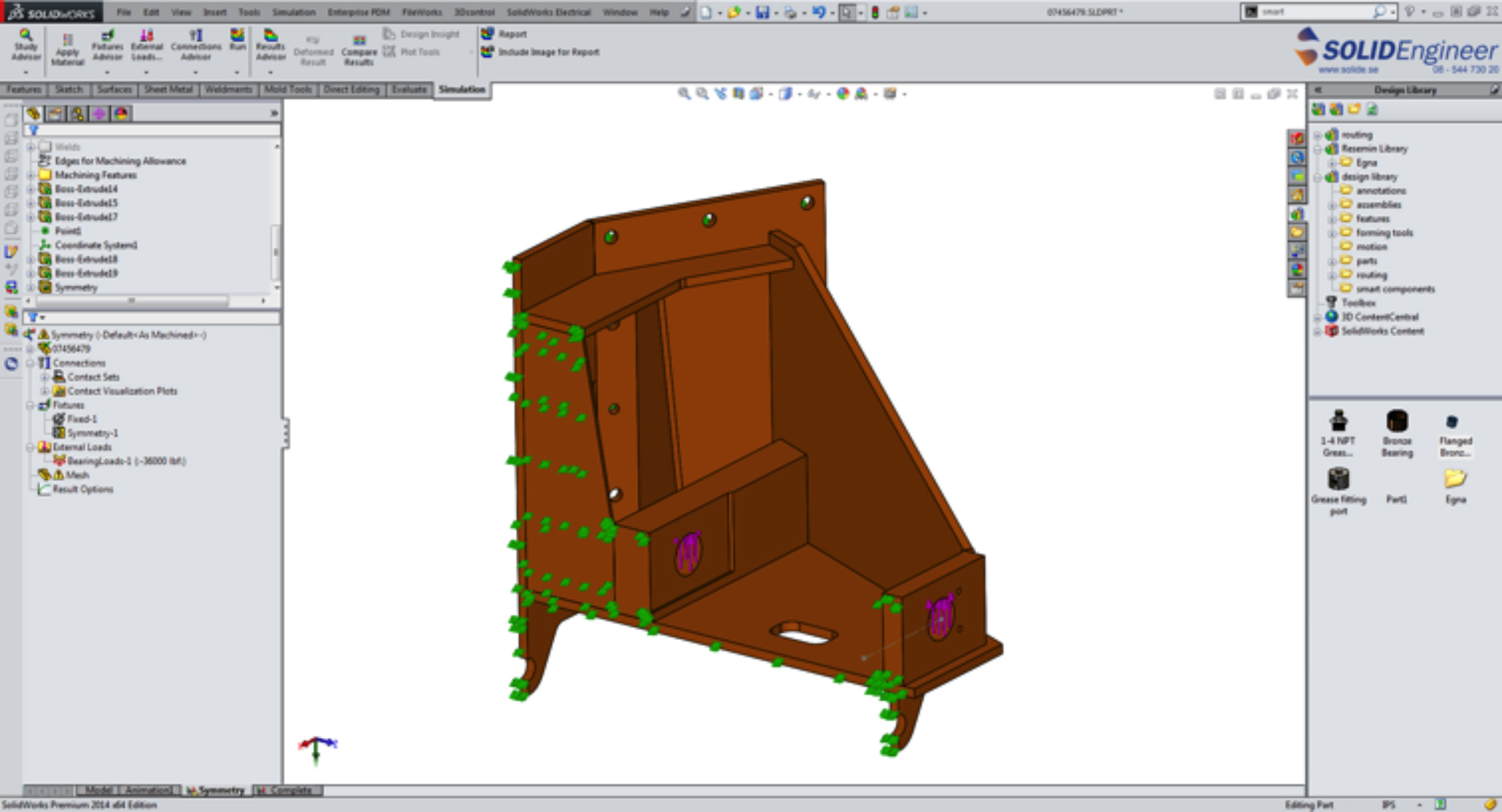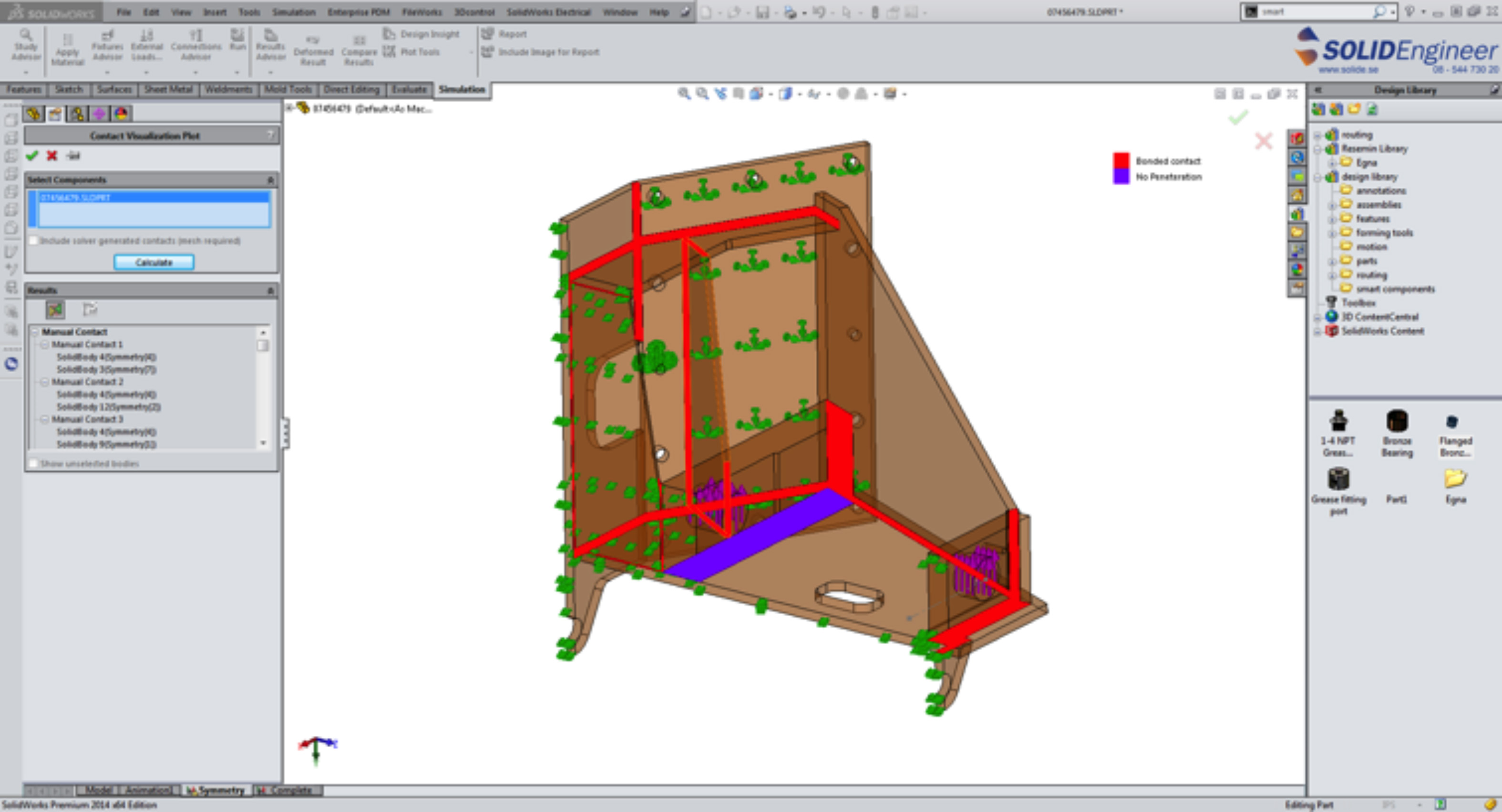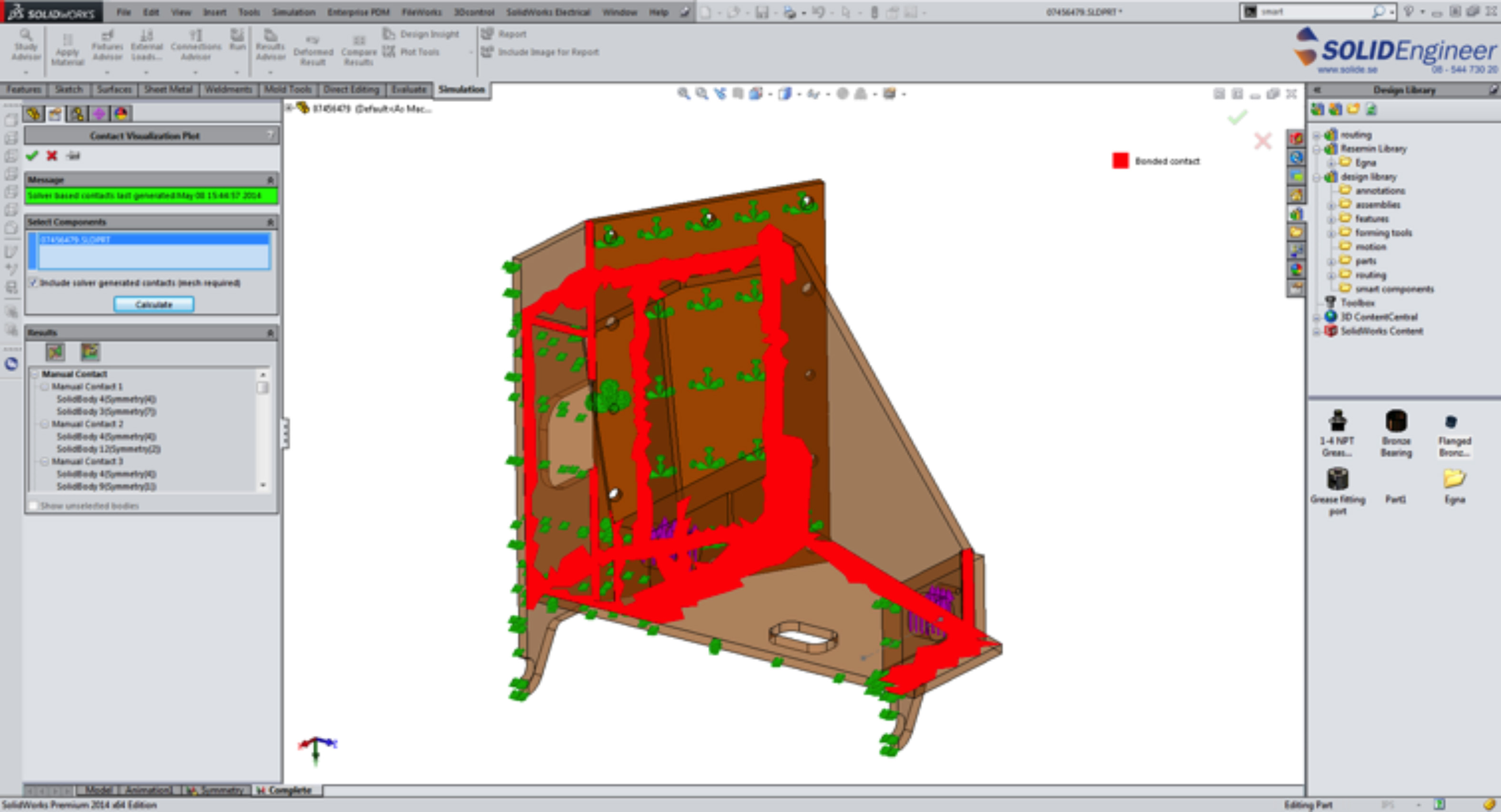I SOLIDWORKS Simulation 2014 kom det en nyhet för att enklare kunna visualisera hur sammanställningen hänger ihop. På detta sätt kan man snabbt se om det är någon koppling som man missat eller valt fel typ på. Denna funktionalitet finns även efter man räknat igenom modellen för att se hur kontakterna ser ut utifrån den mesh man använt.