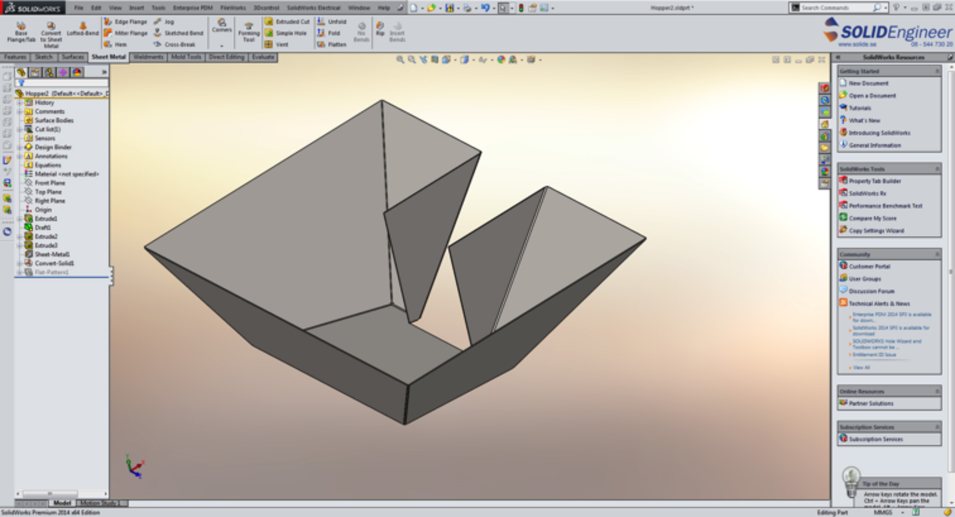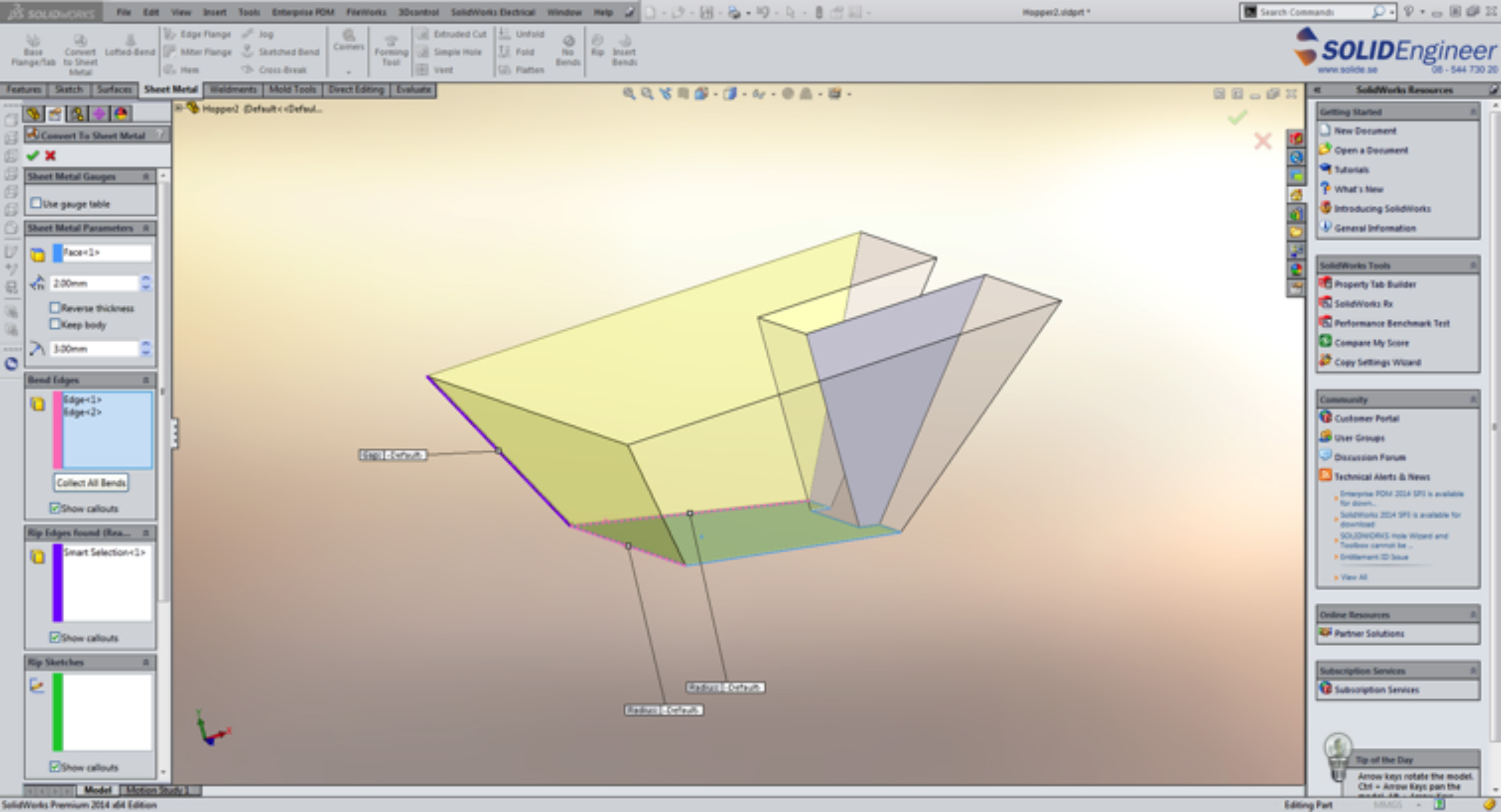Ibland stöter man på plåtdetaljer med många vinklar som inte är 90 grader. Dessa kan vara lite jobb med att få till med edge och miter flange. Då kan man istället använda convert to sheet metal på en solid klump och välja vilka bockar man vill ha på sin utbredda plåt. Du kan även välja att ha kvar soliden som mall ifall du vill dela upp din konstruktion i flera plåtar i en multibodypart.