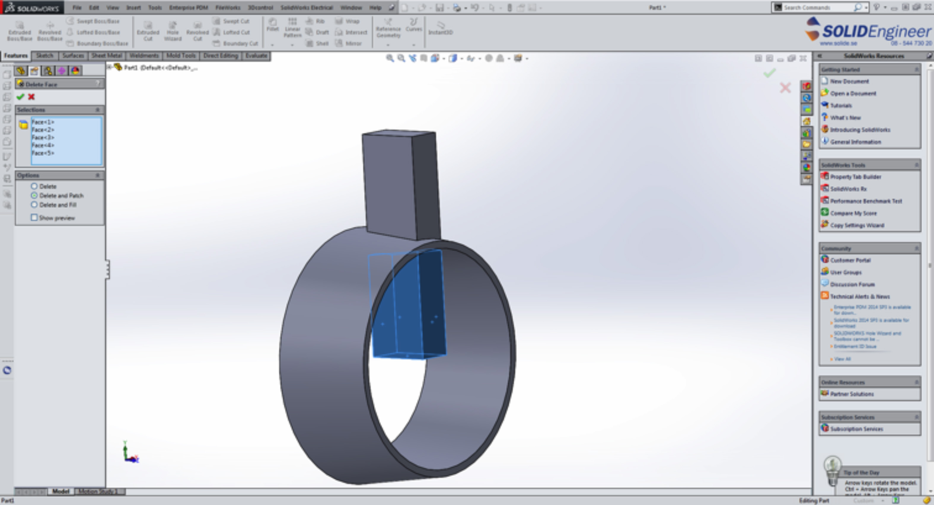 Om man har något som går igenom en yta och vill ta bort detta utstick så kan man använda delete and patch. Starta delete surface, välj de ytorna du vill ha bort och bocka för delete and patch så kommer du få en detalj som är lappad utan utsticket.