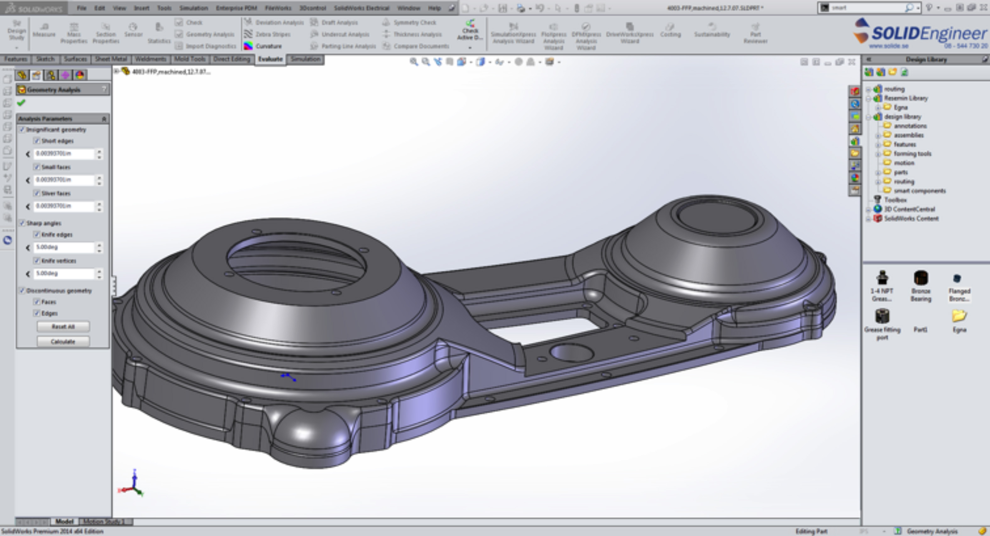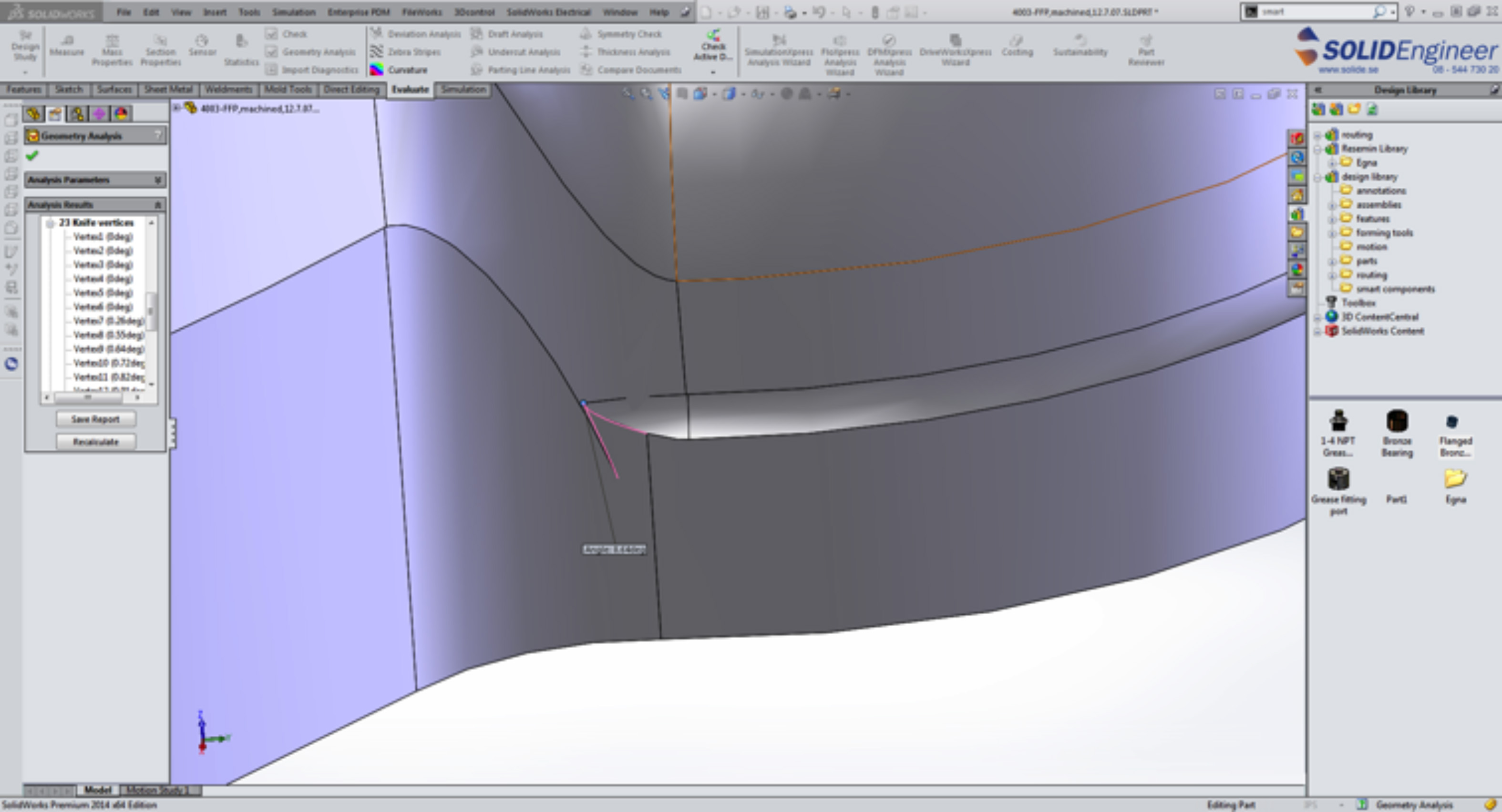 Med verktyget geometry analysis kan man kontrollera sin detalj efter möjliga defekter genom att leta upp små kanter, ytor och skarpa vinklar som ofta kan vara oönskade bieffekter av något man gjort och gör modellen svår att tillverka.