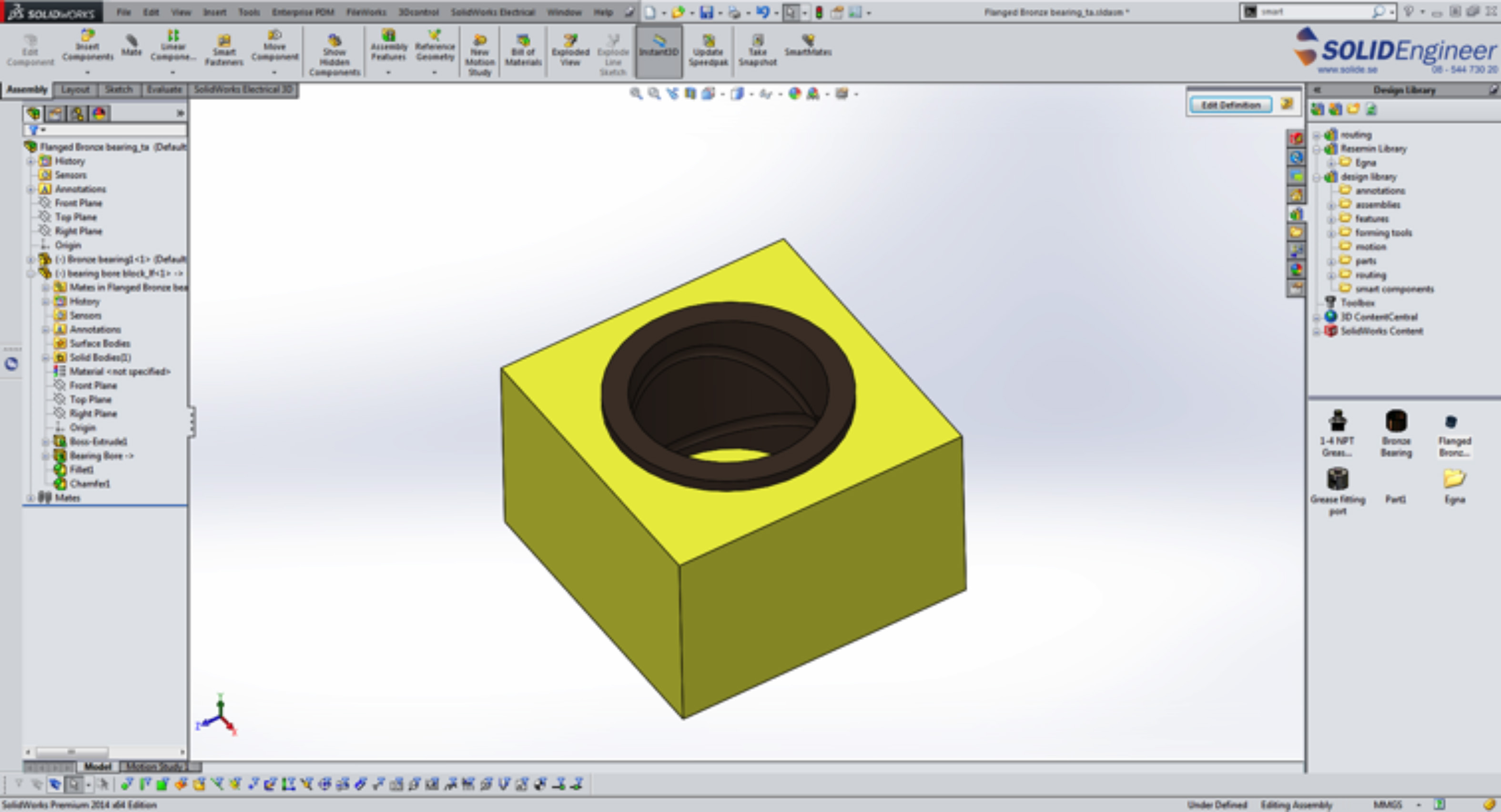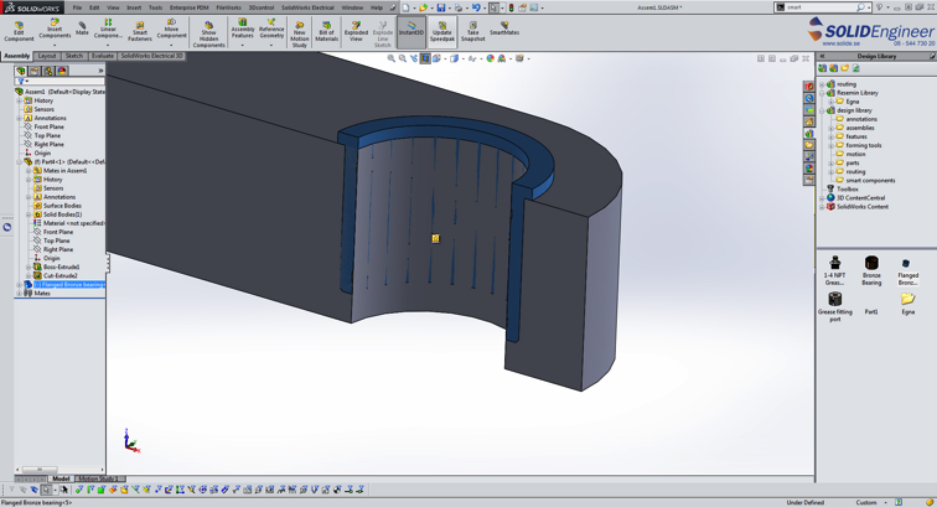 Med smart components kan man lägga in features och komponenter till en annan komponent där denna funktion kan aktiveras när man lägger in denna i en sammanställning. Till exempel en bronsbussning som gör ett spår till sig själv med radier och faser som behövs i denna urskärning.