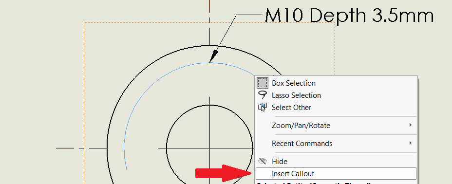 Det enklaste och snabbaste sättet är att helt enkelt högerklicka på den linje som representerar Cosmetic Threads på ritningen, och välja ”Inser Callout”. Då kommer måttet upp som du ser på bilden.