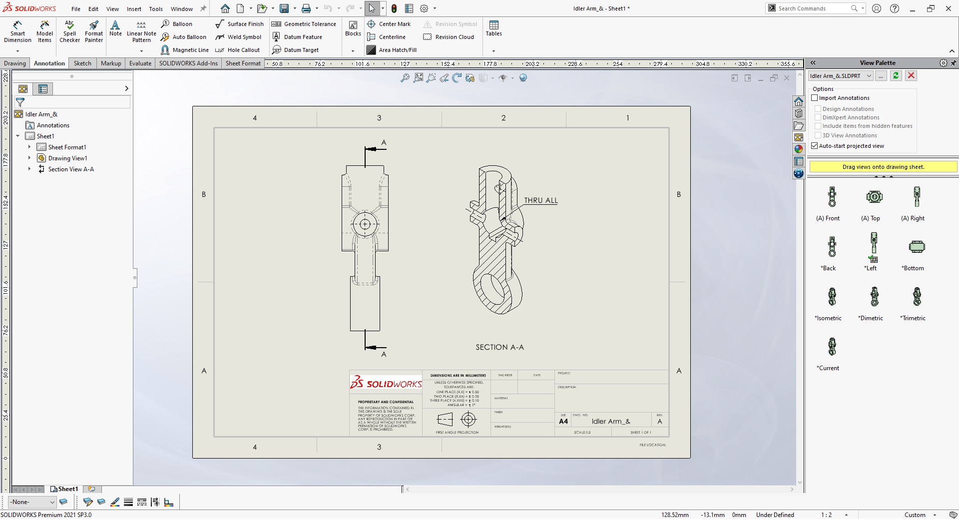 Notera att ifall du har mått utsatta i din Section View så kommer dessa att försvinna när du väljer Isometric Section View. Noteringar och andra annotations, så som exempelvis centrumlinjer, kommer däremot att finnas kvar.