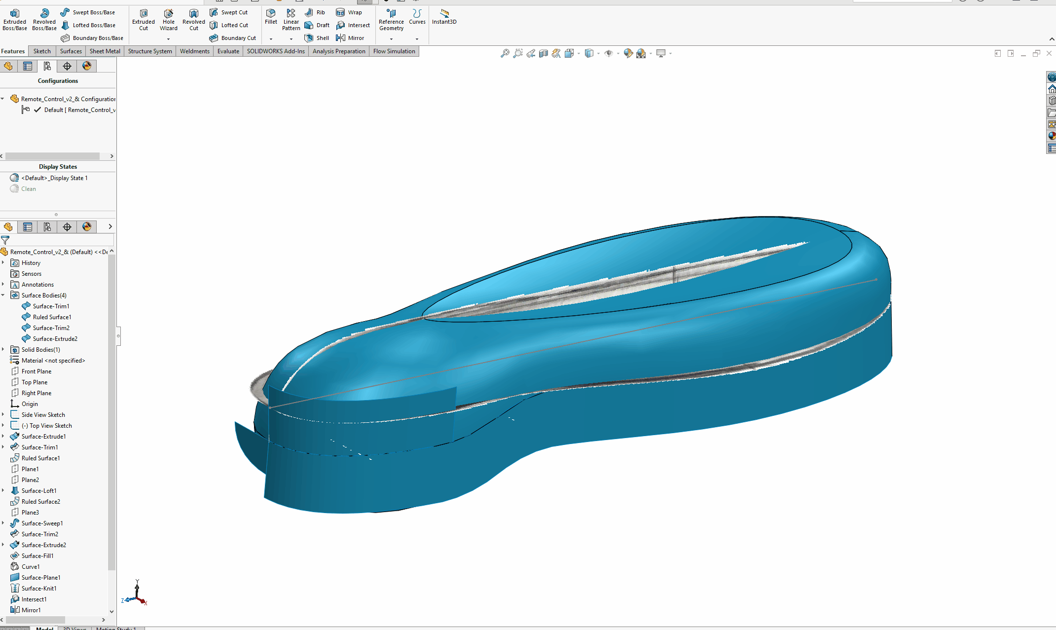 Det första användningsområdet vi ska titta på kan vara tillämpbart när man ritar på en mer komplicerad geometri. Många gånger kan det då vara så att man har en del hjälpytor/referensskisser/etc. som kan skymma den färdiga geometrin. Knepet är då att skapa ett nytt Display state där man döljer allt oönskat. Därefter kan man enkelt växla mellan att se all hjälpgeometri eller ingen alls.