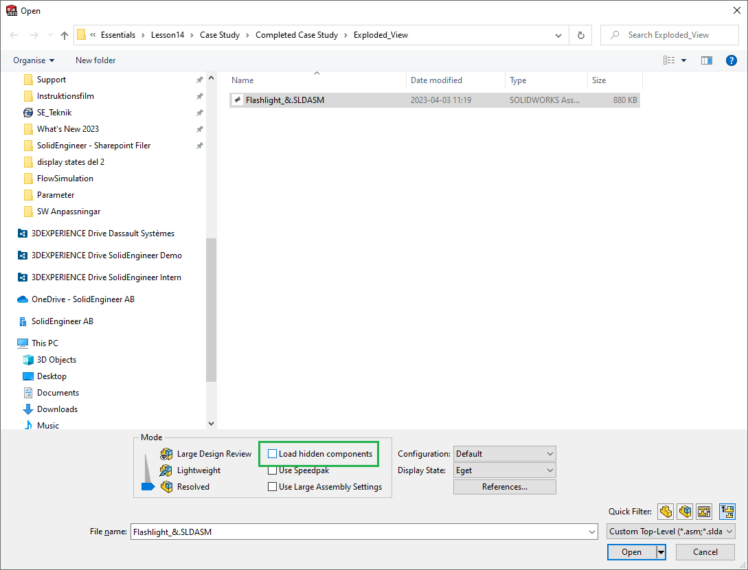 I Open-rutan finns en bock där man kan välja huruvida eventuella dolda komponenter skall läsas in i minnet eller ej. Bockar man ur denna bock bör ni se att det går fortare att öppna sammanställningen och att SOLIDWORKS använder mindre minne. Baksidan av myntet är det tar aningens längre tid att tända en dold komponent då komponenten först måste läsas in i minnet innan den kan visas.