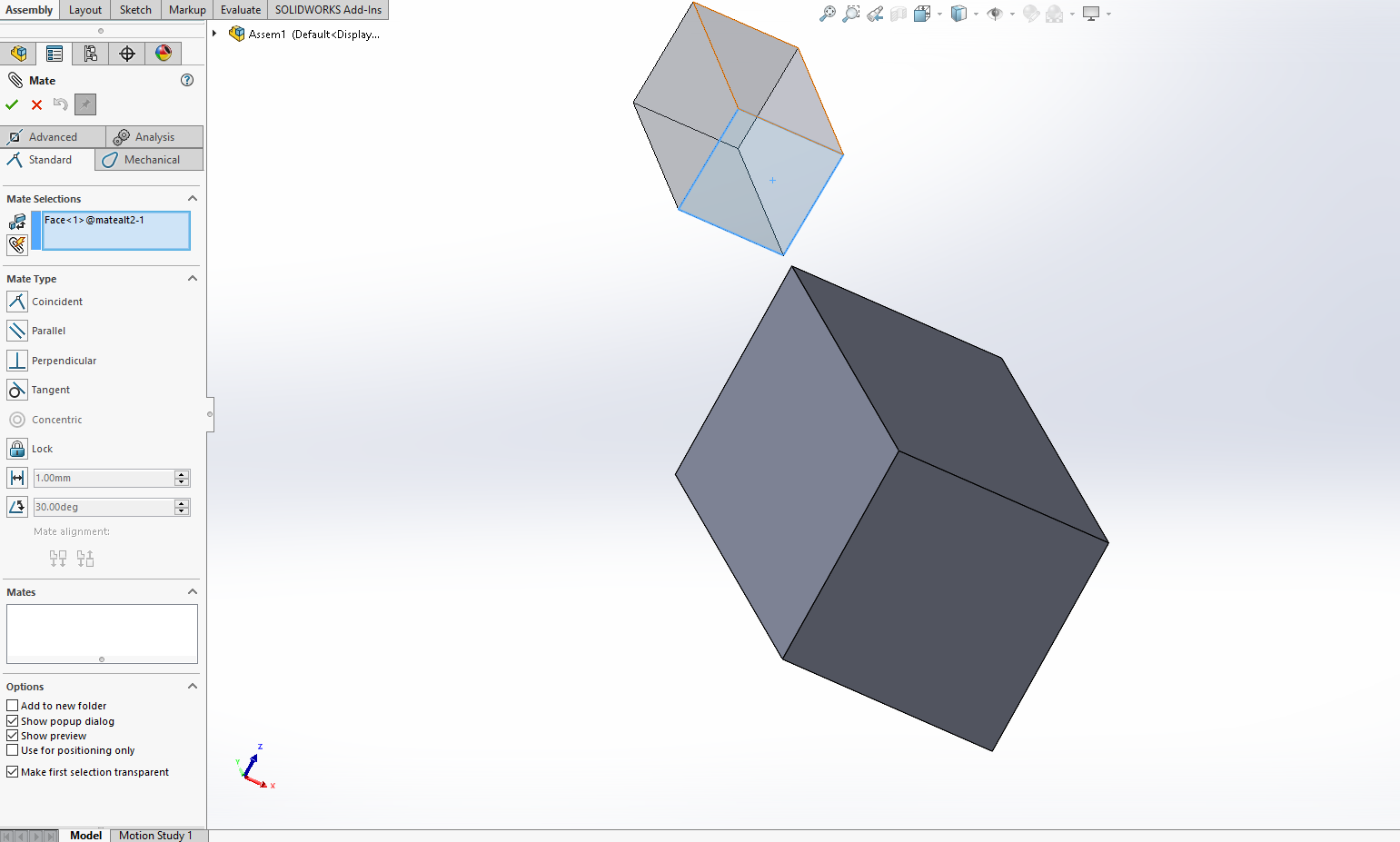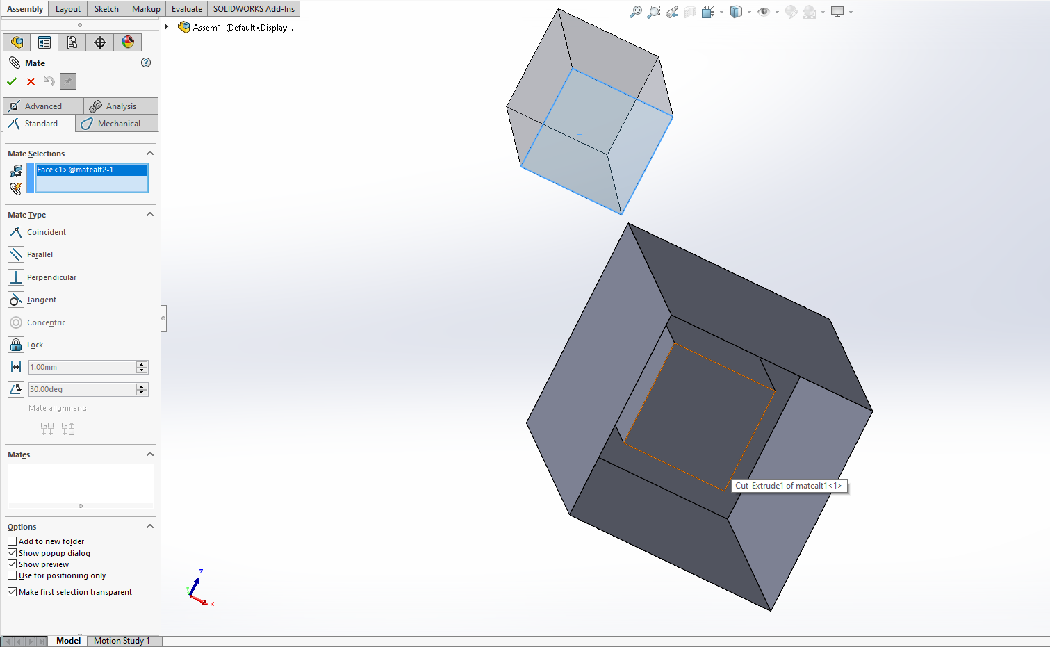 Vi har alla varit i en situation där vi försöker skapa en mate men hur mycket man än vrider och vänder på kameran så går det inte att att välja ytan utan att något kommer i vägen. Sedan SOLIDWORKS 2018 har det funnits ett kort-kommando för att dölja ytor när man skapar en mate, och det är ALT-knappen.