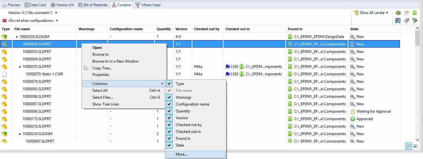 I SOLIDWORKS Enterprise PDM använder man ofta flikarna “Contains” och “Where Used” för att se vad saker består av och var de ingår. Men till skillnad från BOM-fliken så är kolumnerna inte kontrollerade av en central inställning som administratören ställt in.