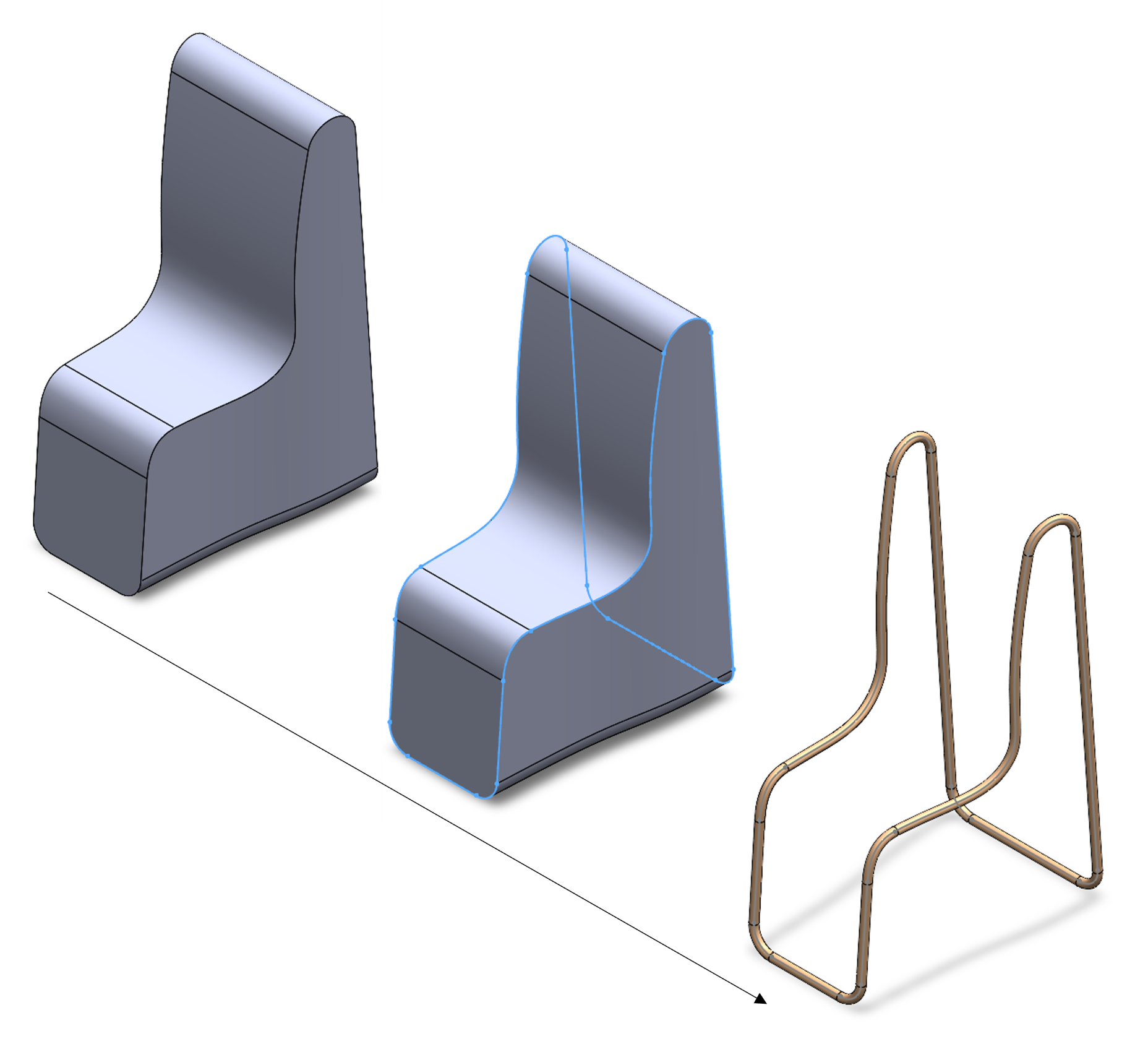 Vi adderar en Fillet ner mot golvet för att få en mjuk övergång mellan sidorna och öppnar sedan en ”3D Sketch”. Vi markerar kantlinjerna vi önskar använda och trycker på Covert Entities. Vi får då en 3D skiss innehållande kurvor som vi kan använda i t ex Swept Surface. Vi väljer Circular Profile i detta kommando och sedan vår 3D Sketch, och sätter önskad profildiameter. Profilen sveps längs kurvan och vår ram är nu klar. Vi går över till rygg och sits och verktyget “Face Curves”.