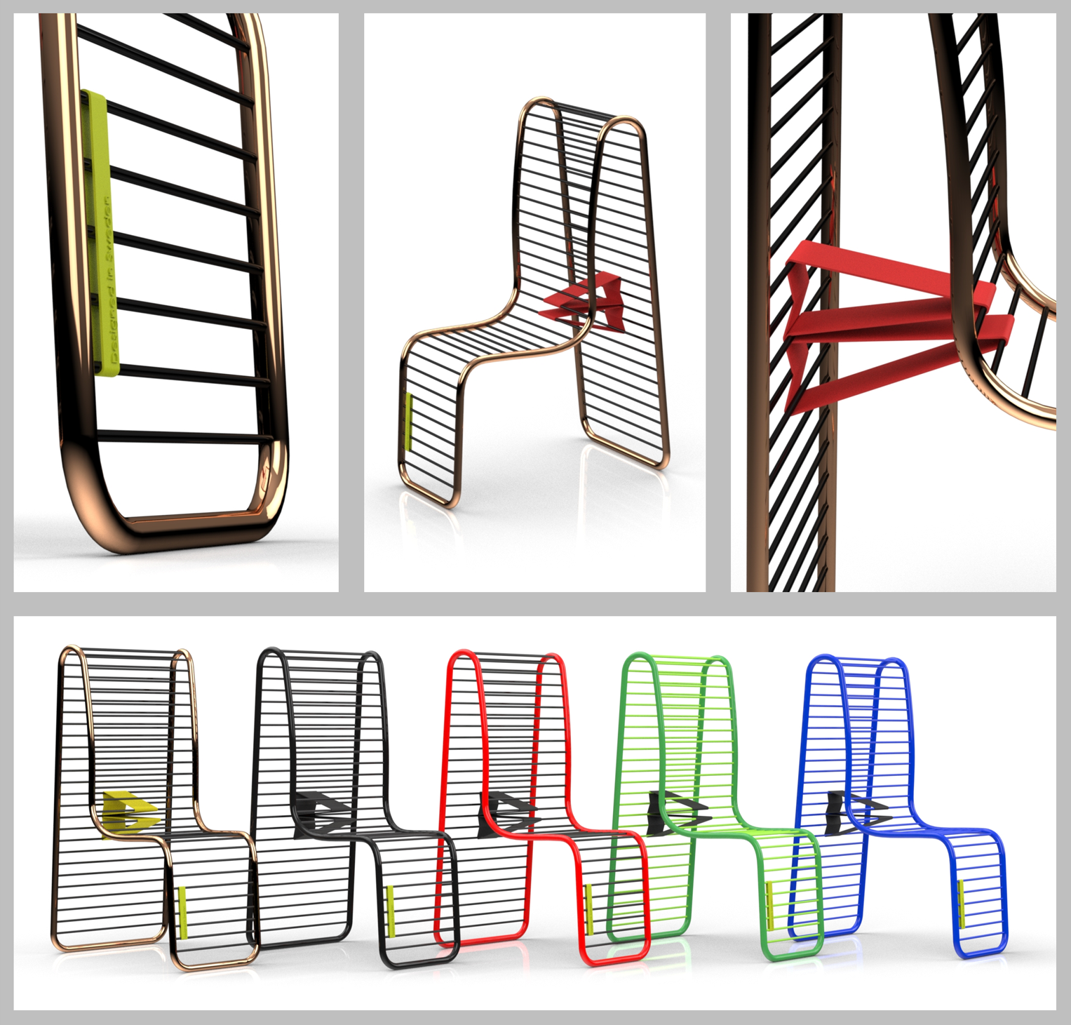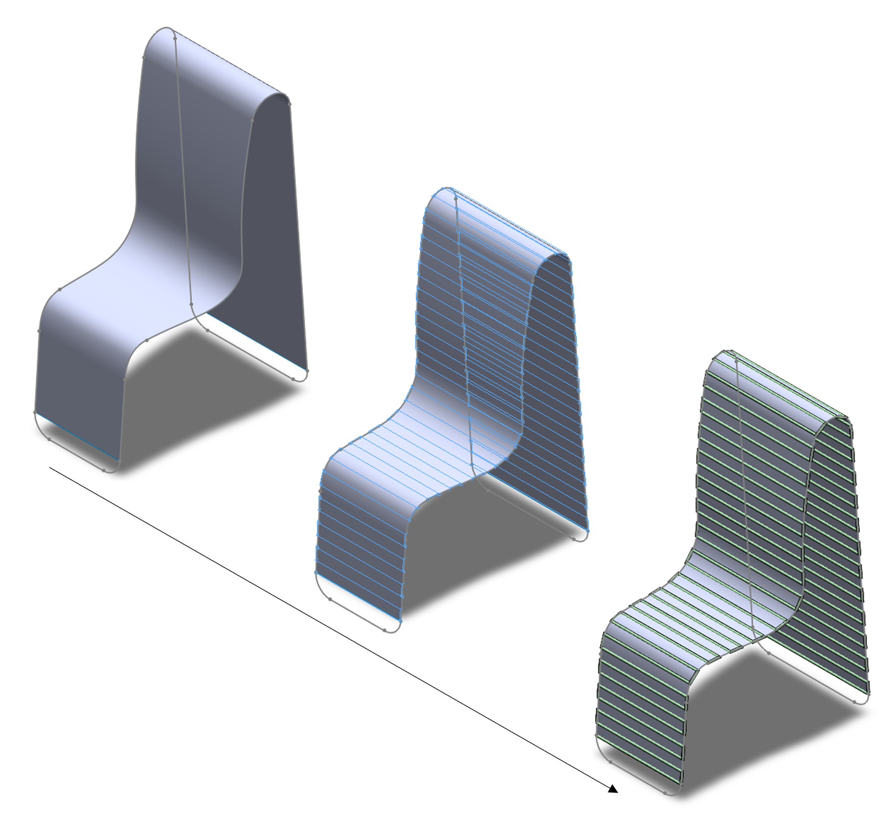 För att skapa de tunna trådarna till sits och rygg skapar vi oss en yta som grundgeometri. I detta fall använder vi återigen Convert Entities för att plocka linjer från grundgeometrin. Grundytan skapar vi här med Lofted Surface mellan två 3D skisser. Markerar vi sedan ytan och väljer Tools -> Sketch Tools -> Face Curves får vi möjlighet att skapa önskat antal kurvor på ytan. Kurvorna kan vi sedan konvertera över i en ny 3D Sketch där vi binder ihop ändarna så att vi får en kontinuerlig kurva. Sen sveper vi som tidigare en Circular Profile längs kurvan och får på så vis våra trådar.