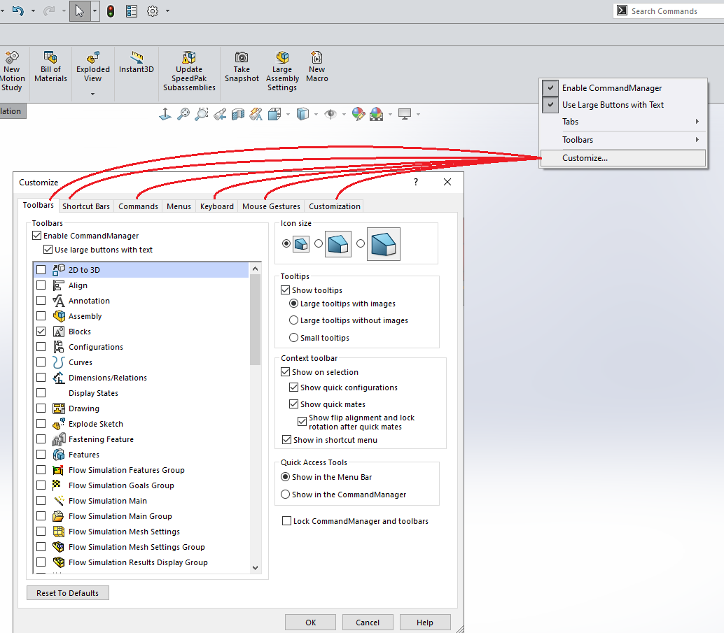 Ctrl + Tab: Växla mellan alla öppna dokument i SOLIDWORKS som liknar Alt + Tab i Windows.