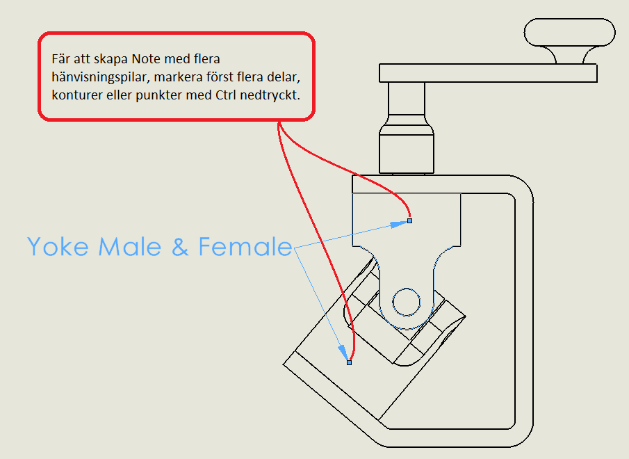 För att skapa flera hänvisande pilar från en anteckning (Note), håll ner Ctrl och markera flera saker i en ritnings-vy.