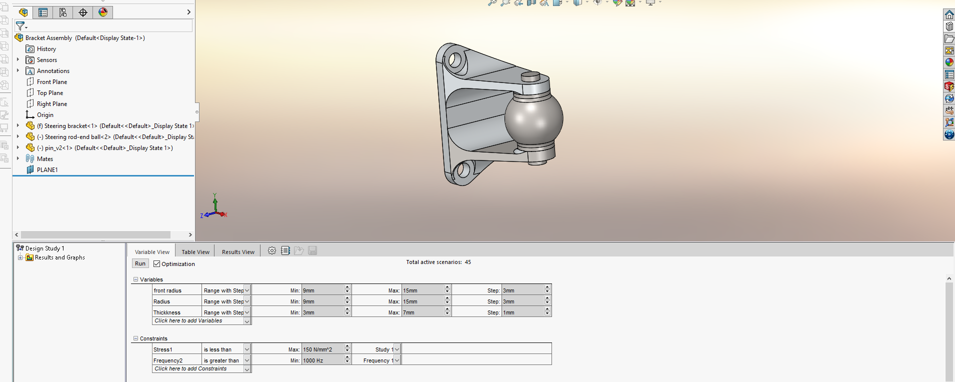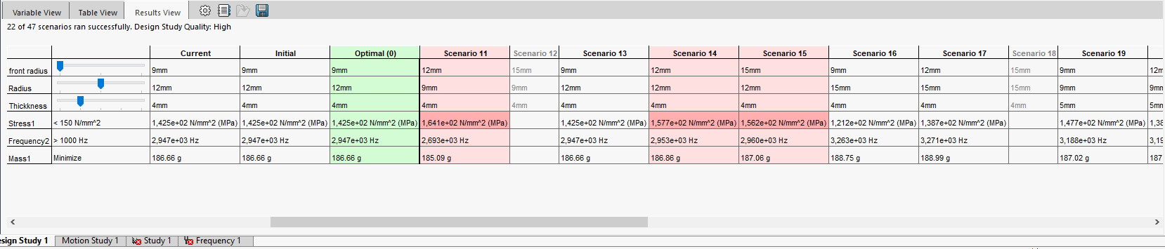 Jo det är här designstudie optimering kommer in i bilden, den har inte alls möjlighet till lika radikal förändring av modellen som topologistudien har. Utan här väljer man några få attribut och sätter ett spann som man vill att detta ska hålla sig inom. Så som vi ser i exemplet nedan så har vi valt att andra några radier inom ett intervall och tjockleken mellan 3–7 mm för att testa om vi kan komma ner i tjocklek och då antagligen vikt genom att modifiera radierna.