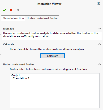 Funktionen har två flikar. De ena, underconstrained bodies, visar om det finns kroppar med lösa frihetsgrader samt vilka dessa isf är. Resultate visas dels i en lista, dels grafiskt på skärmen.![]()