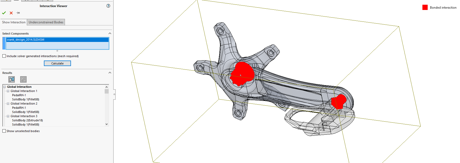 Det finns en flik till här som heter show interaction, denna gör precis tvärtom mot unconstrained bodys kan man säga. Den visar alla ställen det finns kontakt och viken kontakttyp det är. Detta är också ett väldigt bra verktyg för att se att modellen inte sitter fast mer (eller mindre) än man hade tänkt. Här kan man även bocka i en ruta för att se hur kontakten verkligen blir beroende på mesh storleken. Denna komma kräva att man gör en mesh först och blir då lite långsammare att få fram.