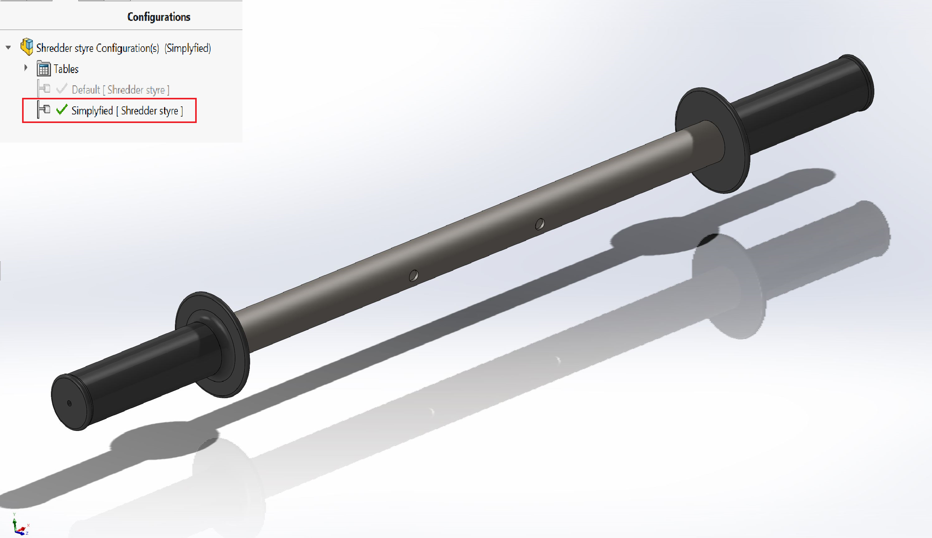 Går vi ännu ett steg högre och kollar på huvudsammanställningen, så har vi här en så kallad Shredder med en mängd ingående komponenter. I många fall, när en produkt är färdigkonstruerad och placeras i ett annat kontext, så behövs inte alla detaljer. I dessa fall, är det då bra om sammanställningen går att förenkla smidigt. Och vad är då inte smidigare än att bara byta konfiguration? I bilden nedan, syns den kompletta modellen av Shreddern, samt en extremt förenklad modell, som fortfarande ger en överblick på produktens geometri.