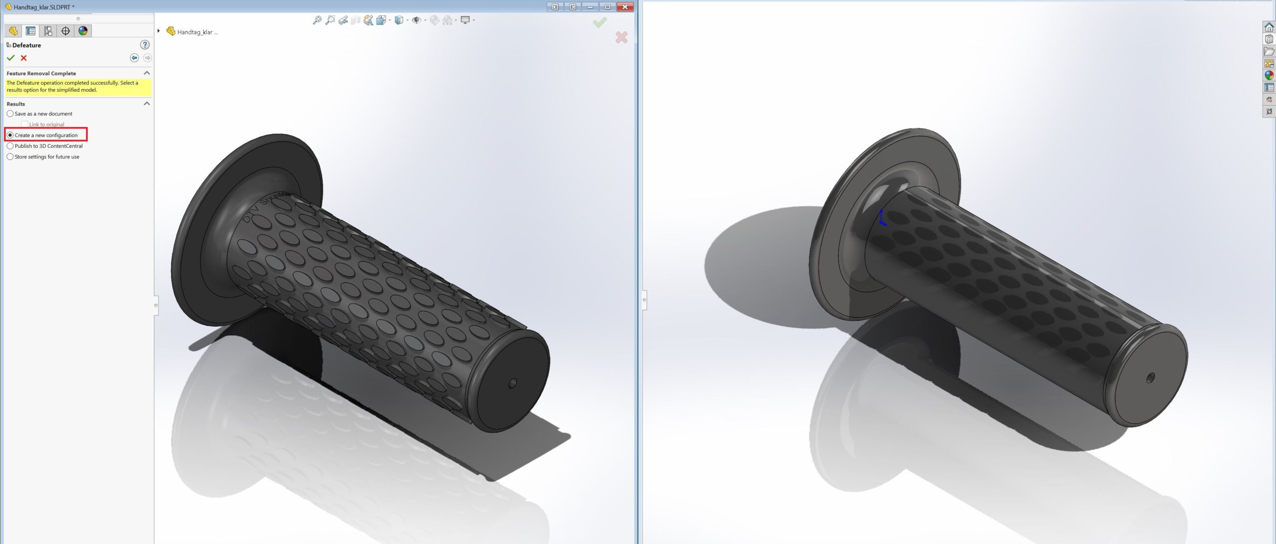 I slutet av förra året åkte vi runt på vår What’s New turné, där vi berättade om nyheter i SOLIDWORKS 2023. Om du var med på något av våra stopp under turnén, så vet du säkert redan om den här funktionen. Kommandot Defeature är ingen nyhet i sig. Detta används för att förenkla modeller genom att ta bort features. Nyheten med detta kommando är att det nu går att spara den förenklade modellen som en ny konfiguration. I bilden nedan visas ett exempel där ett handtag förenklas genom att ta bort greppmönstret samt en text som är placerad på den cylindriska ytan.