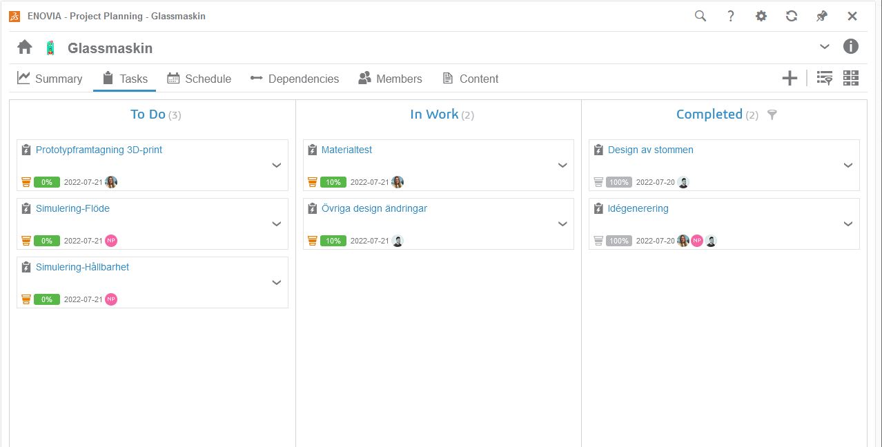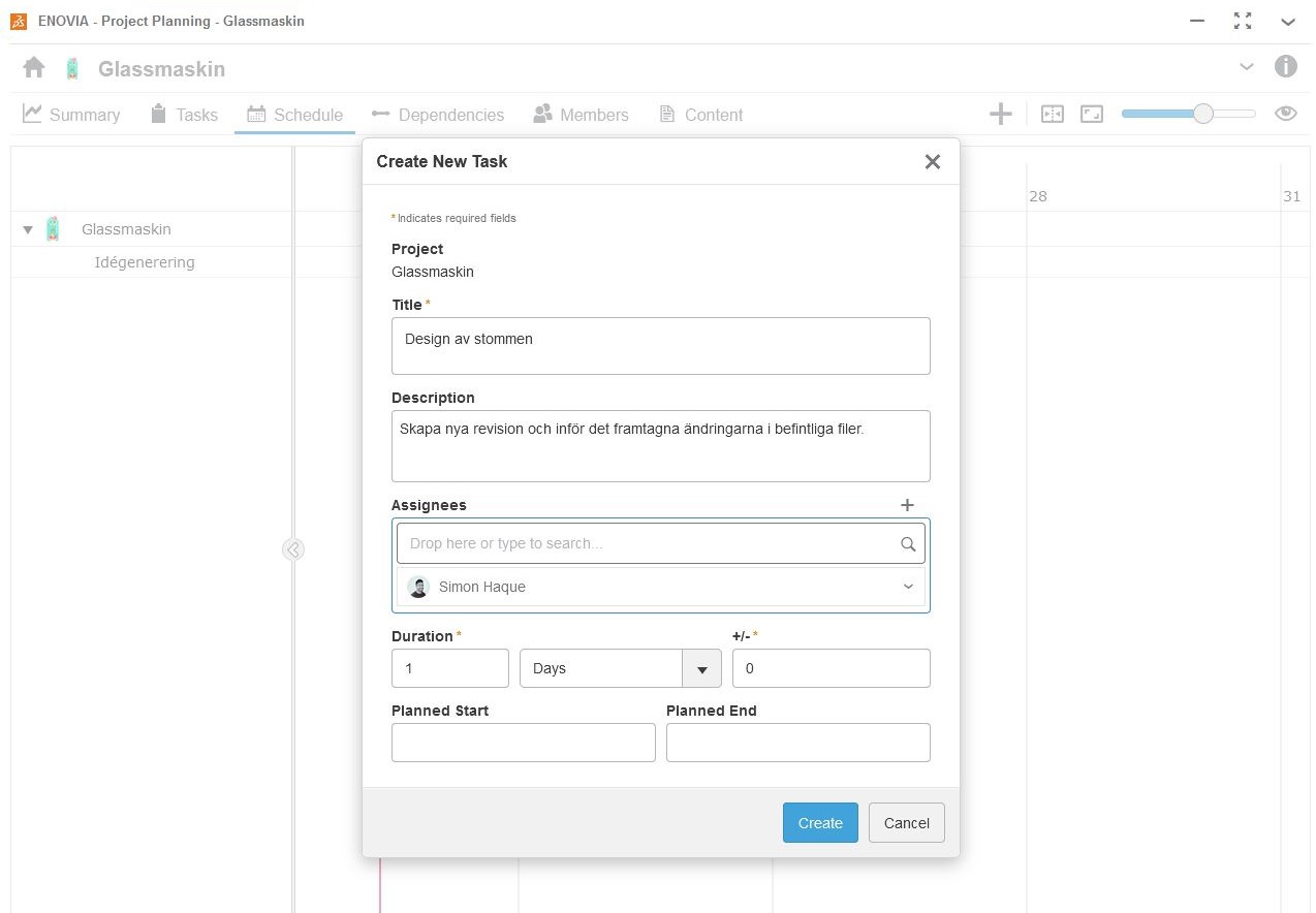 Vad gör man då med detta verktyg? Project Planning förbättrar möjligheterna till att hantera och samla information kring projekt direkt i din 3DEXPERIENCE plattform. Till exempel så kan du skapa och tilldela uppgifter till andra användare. Använd sedan appen för att få en överblick av projektet ifråga. Att allt är kopplat till plattformen gör det enkelt för alla deltagare att få tillgång till informationen, då allt du behöver är en internetuppkoppling.