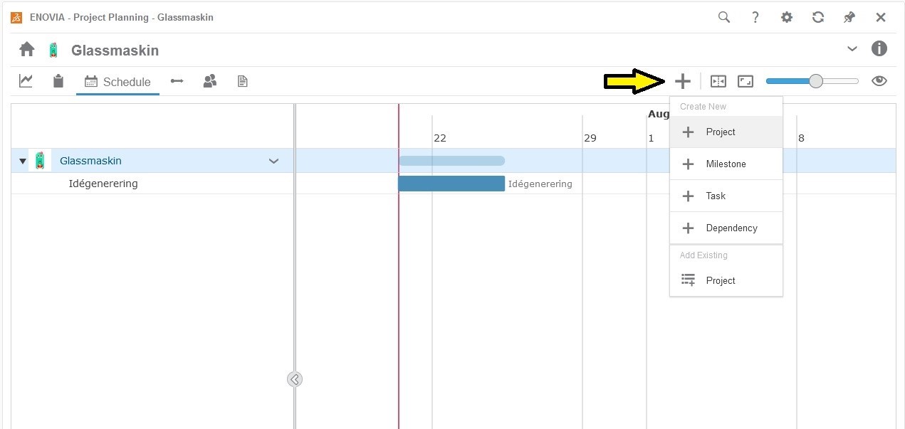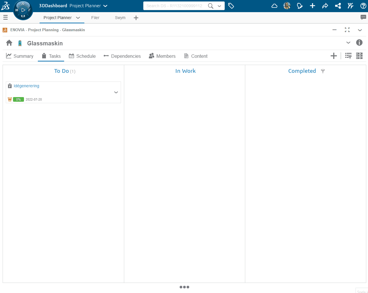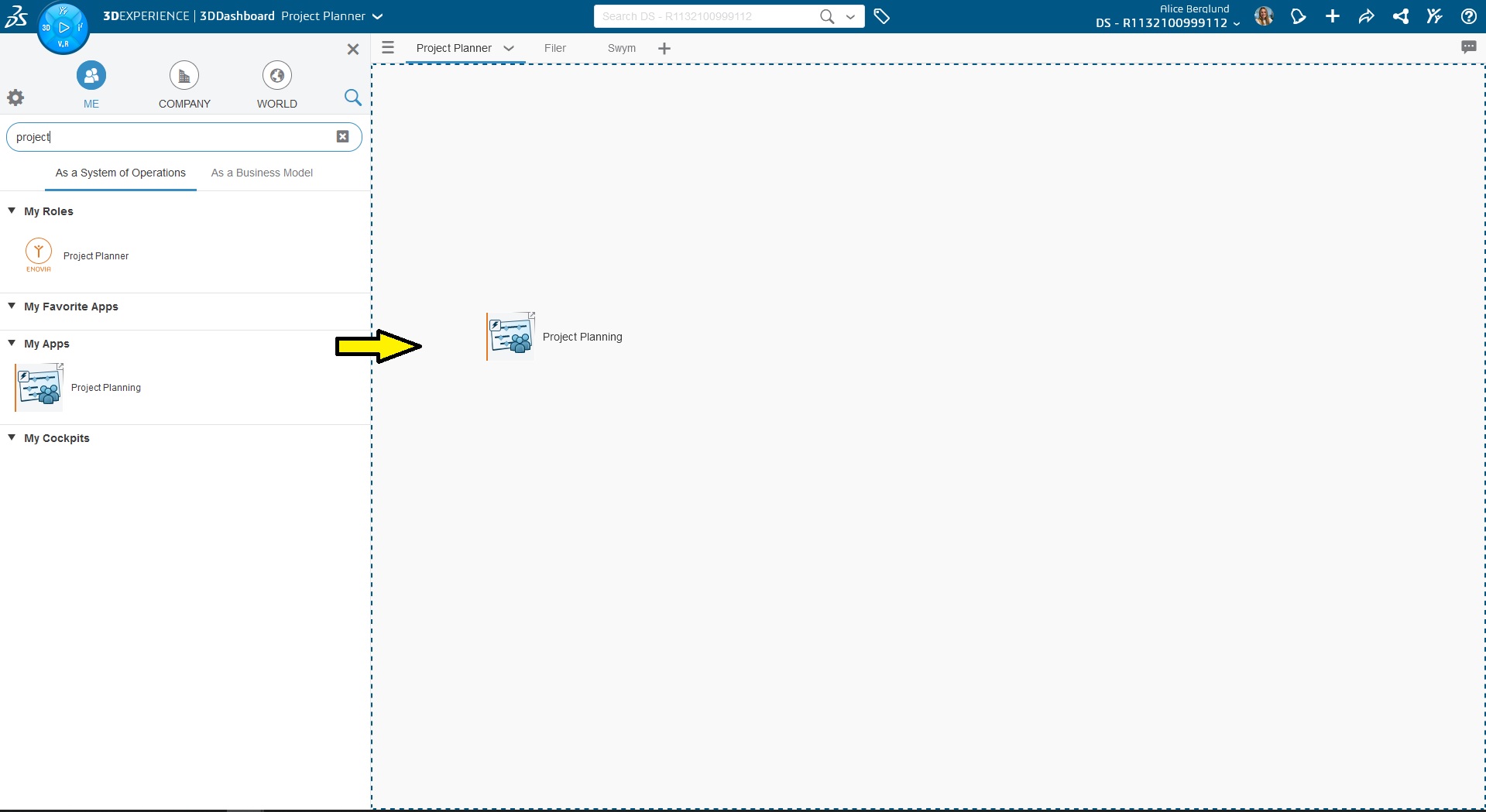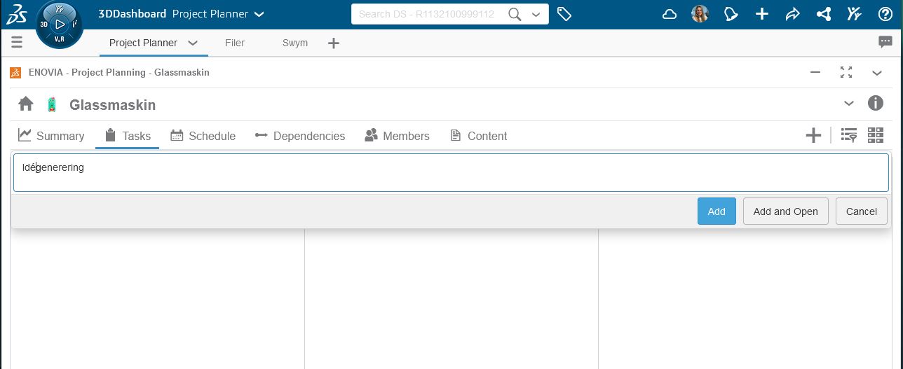 Som tidigare nämnt så är Project Planning en app som du arbetar med i 3DEXPERIENCE plattformen. Börja med att skapa en ny flik i den dashboard du arbetar i. Sök sen upp appen Project Planning och dra in appen i fliken.