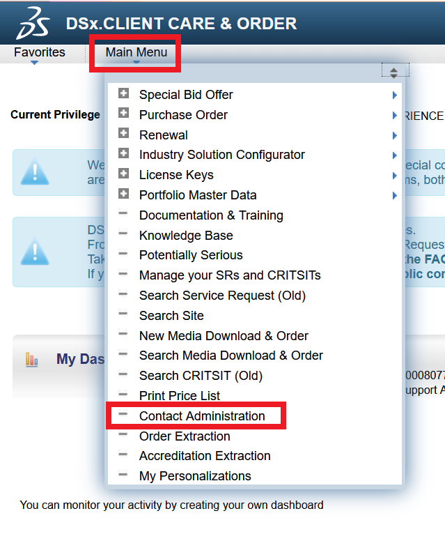 2. Gå till Main Menu > Contact Administration. Där visas en lista med alla kontakter som finns inlagda som kontaktpersoner.