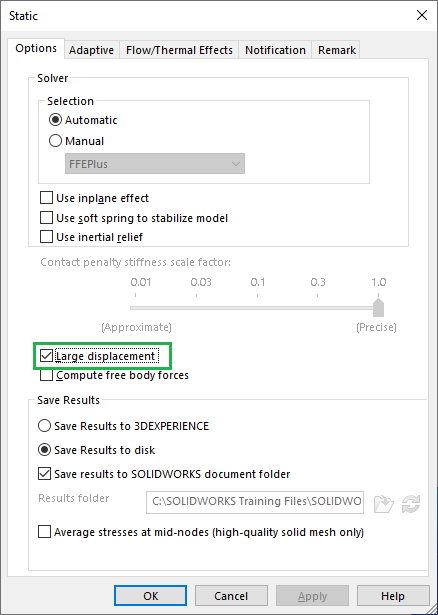 “Excessive displacements were calculated in this model. If your system is properly restrained, consider using the Large Displacement option to improve accuracy of the calculations. Otherwise, continue with current settings and review the causes of these displacements. Click ‘Yes’ to solve with the Large Displacement flag activated. Click ‘No’ to solve with small displacement. Click Cancel to end the solution.”