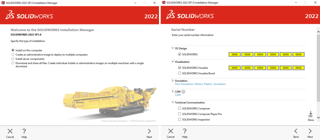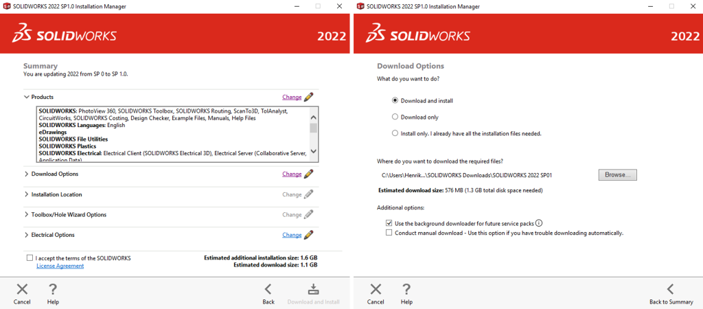 När filerna väl packats upp så startar SOLIDWORKS Installation Manager upp automatiskt. Det är säkrast att först välja “Download and share all files.”-alternativet för att hämta installationsfilerna, för att därefter köra igång installationen. Då behövs ca 15 GB utrymme på hårddisken. Starta därefter upp Installation Managern på nytt och välj “Install on this computer”. I första steget blir man ombedd att fylla i licensnycklar för de programvaror som ska installeras.