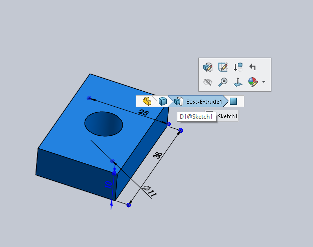 Jag brukar säga att i SOLIDWORKS så behöver man bara lära sig 2 knappar så jag tänker att jag avslutar med att berätta om den andra knappen man behöver kunna och det är D. Det D gör är att ta fram ”selection bread crumbs”. Detta innebär att all tillgänglig info om part/assy och allt man kan göra med den dyker upp i ett hierarkiskt träd: part-body-feature-face på en part. Där det framförallt är extra värdefullt i sammanställningar för att kunna hitta rätt nivå av undersammanställning och utföra det man behöver med den.s-knappen exempel