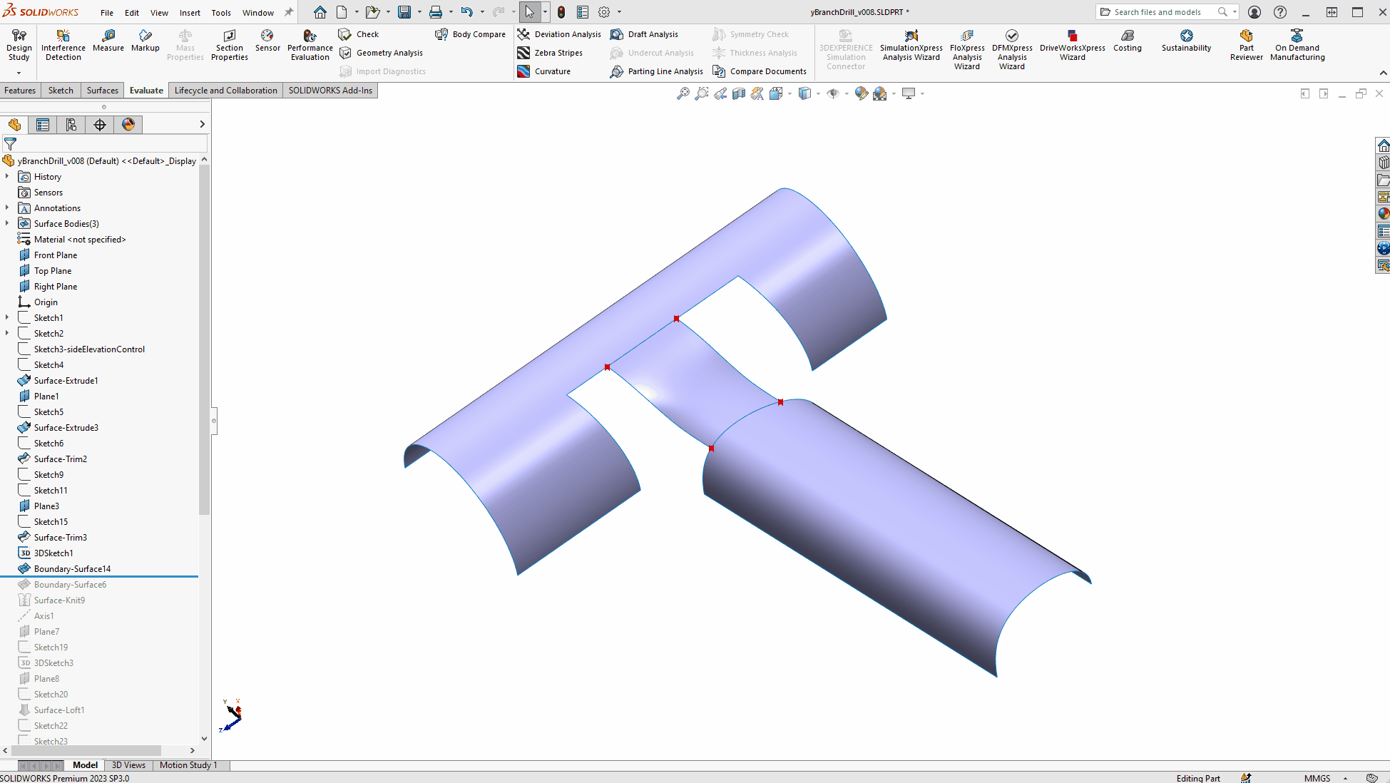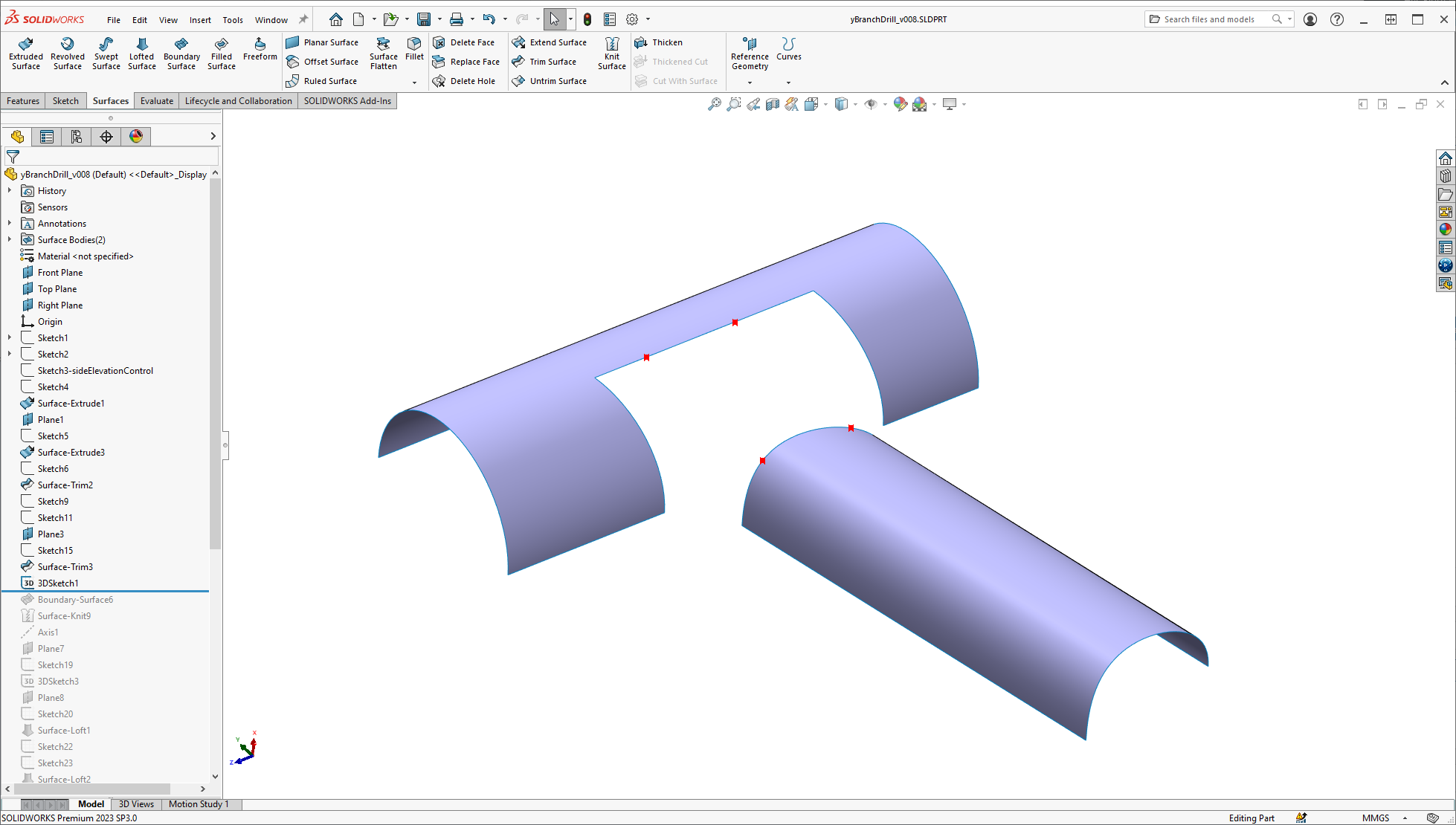Väljer man en kant som utgångspunkt så kommer ytan använda hela den valda kanten. Det är nu vår 3D-skiss kommer in i bilden. Vi kan nämligen ta tag i de gröna och rosa bollarna och snäppa fast dem i respektive skisspunkt. På detta vis kan vi begränsa utbredningen. Detta är också associativt på så vis att om skisspunkterna flyttar sig kommer ytan att följa med.