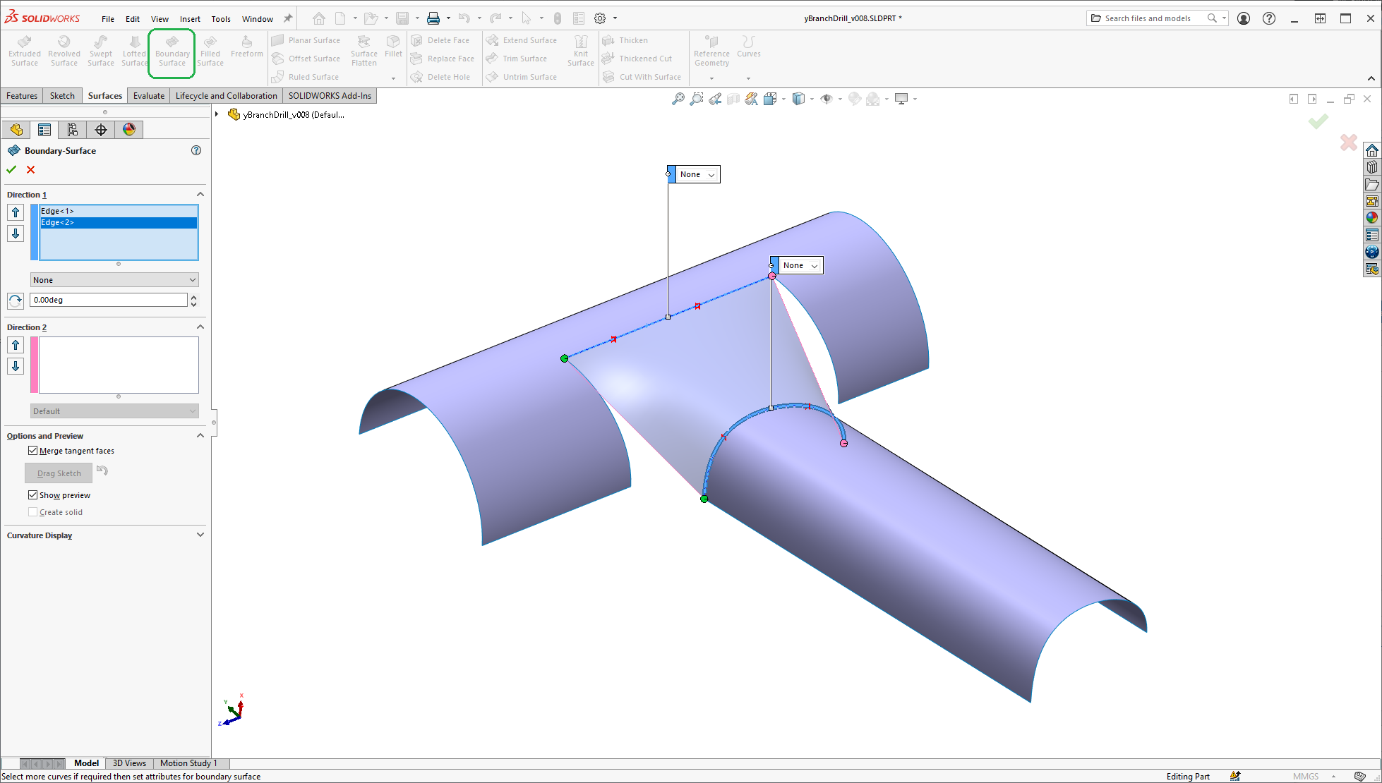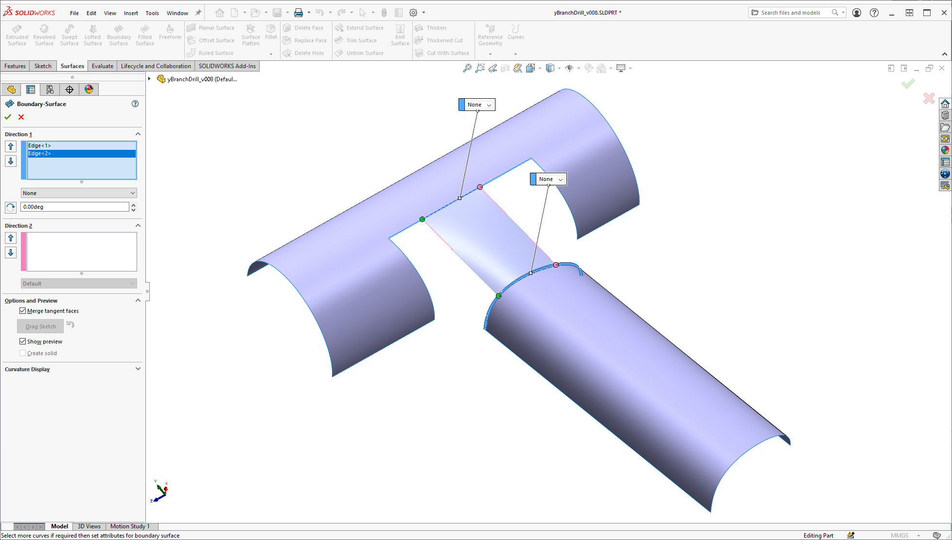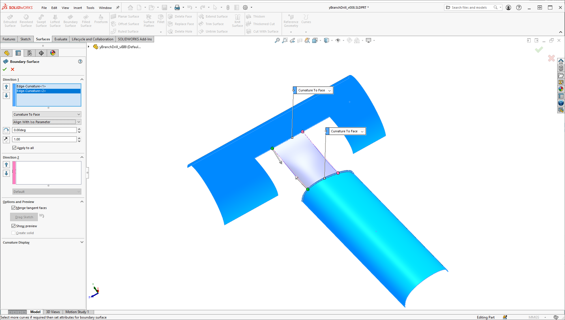För att få en kontinuerlig övergång ändrar vi från None till Curvature to face för bägge kanterna. Notera att övergången mellan ytorna blir mjukare, men också att den resulterande ytor antar en S-form där den svänger från den ena ytkroppen till den andra.