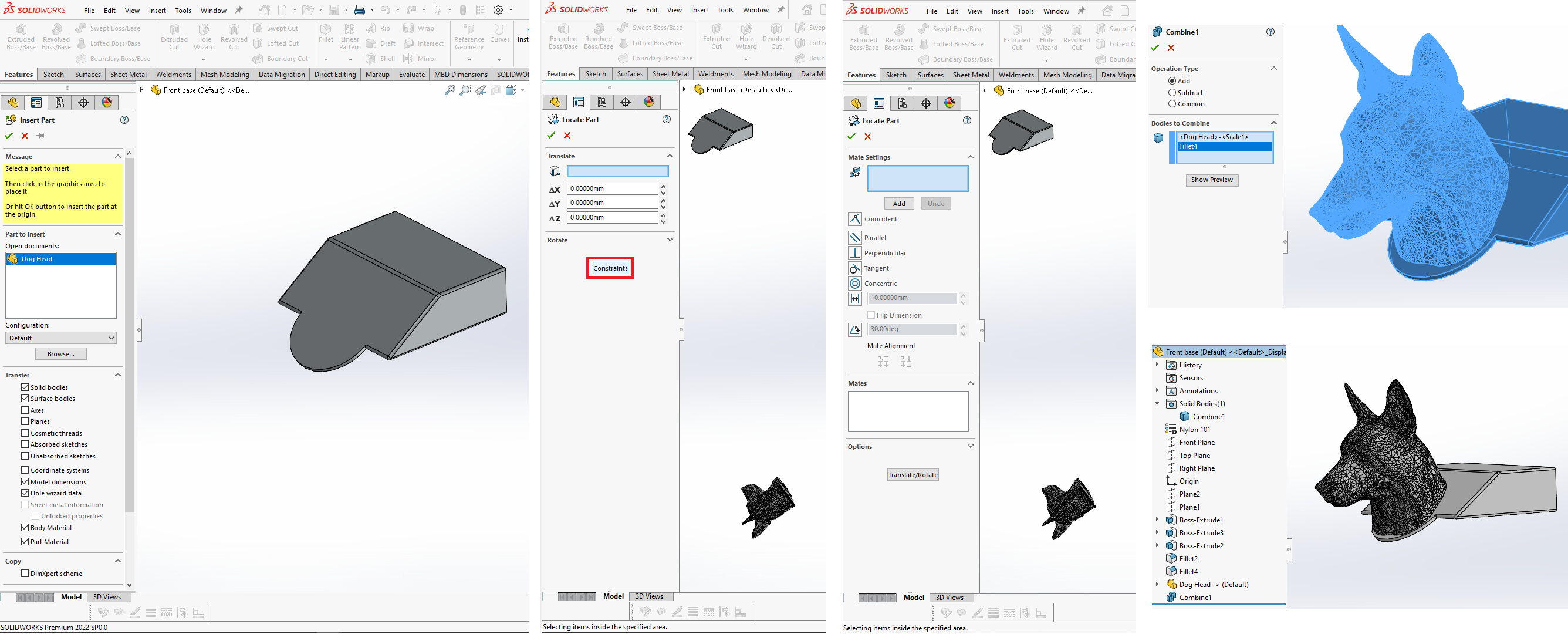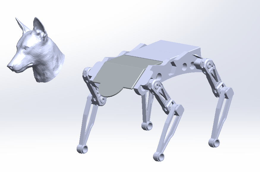 1. I det här exemplet används en robotkropp ritad i SOLIDWORKS som ska kopplas ihop med ett 3D-skannat hundhuvud från en STL-fil.
