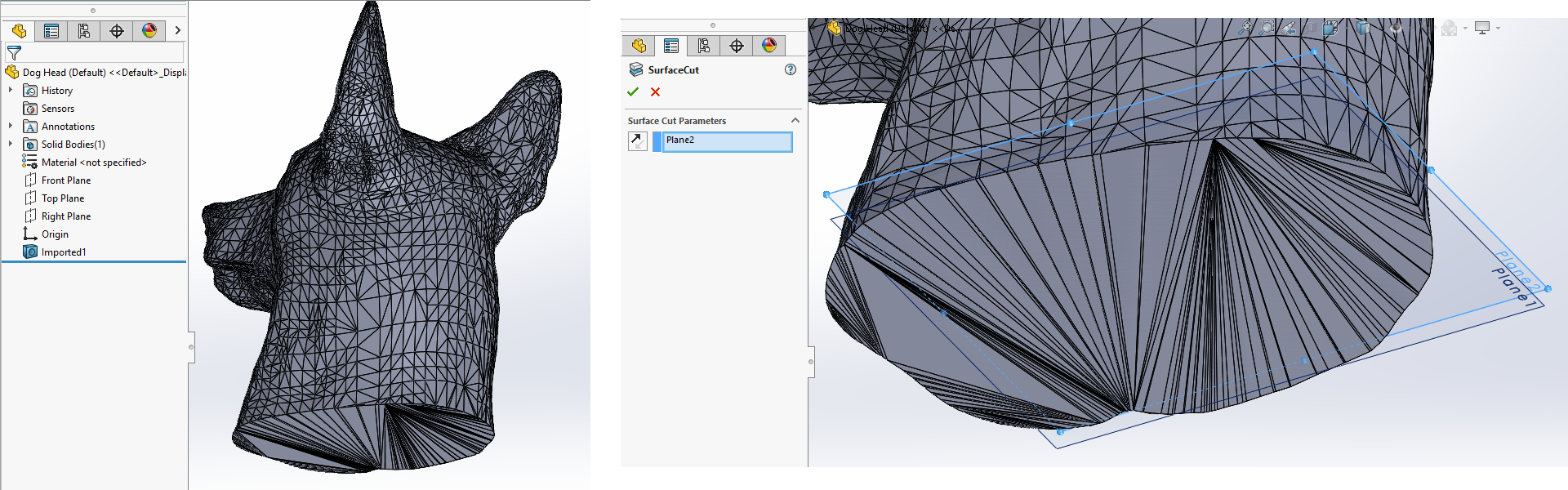 2. Först importeras den och konverteras till mesh-body samt skär till en plan yta undertill. Det alltså utmärkt i SOLIDWORKS 2022 att applicera vanliga features på en tesselerad STL-fil. Ett smart sätt är annars att först konvertera STL-filen till STEP-formatet för att sammanfoga alla tesselerade ytor den utgörs av.