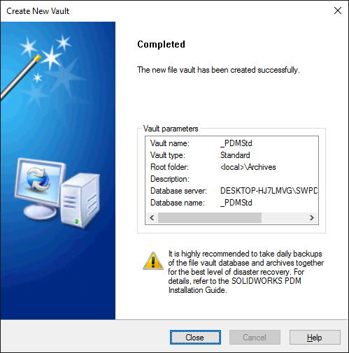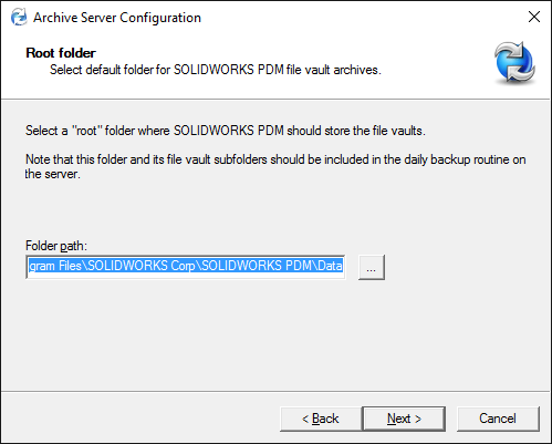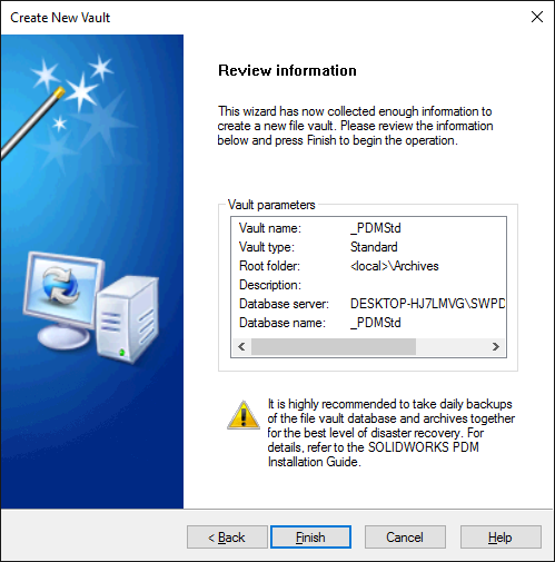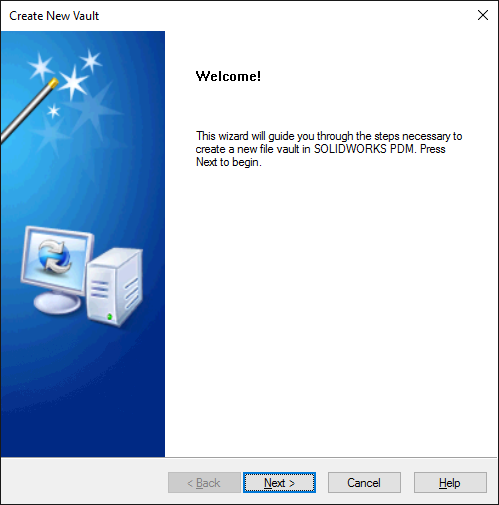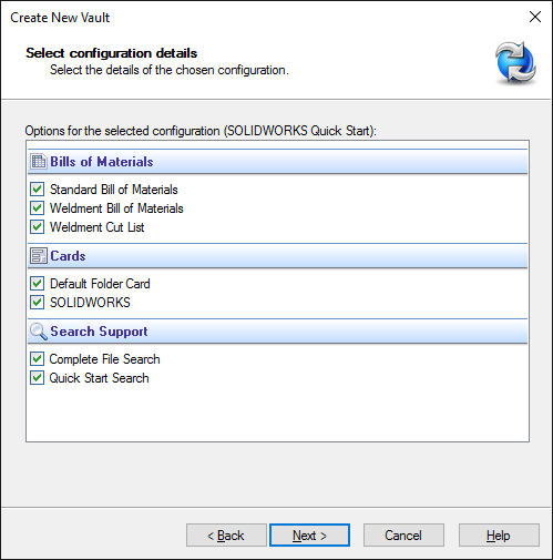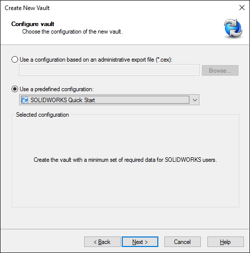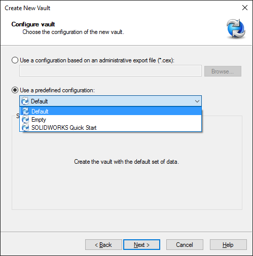 I detta steg så väljer man hur valvet ska konfigureras. Det finns tre stycken fördefinierade konfigurationer som tillhandahålls, eller så kan man läsa in en exporterad konfiguration och läsa in den. Default och SOLIDWORKS Quick Start har innehåll medan Empty är helt tom, så den bör man inte välja.