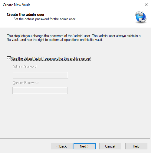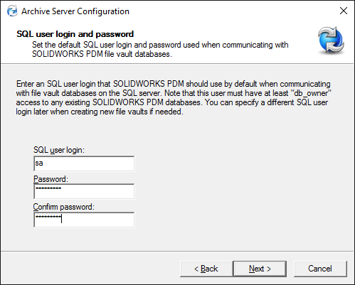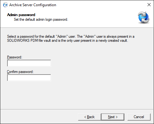 I detta steg så väljer man lösenordet för PDM användaren Admin, Admin är en användare som alltid finns i ett PDM Standard, och i PDM Professional, filvalv, den användaren har fullständiga behörigheter i PDM systemet.