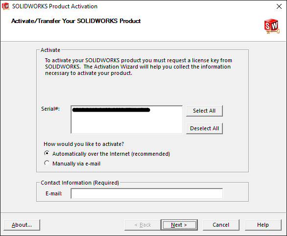 Om du har mer än ett serienummer klicka på ”Select All”, välj att aktivera automatiskt över Internet, mata sedan in din epostadress och klicka på Next.