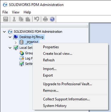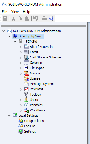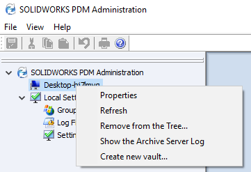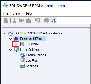 När installationen är klar så startar man SOLIDWORKS PDM Administration verktyget, klicka på > vid valvet som skapats.