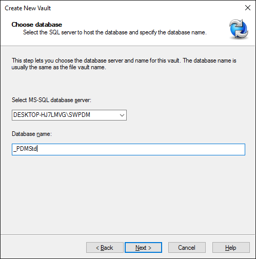 Här väljer man vilken SQL databasserver som ska användas för valvet, välj i drop-down listan. Databasnamnet ska vara samma som valvet.