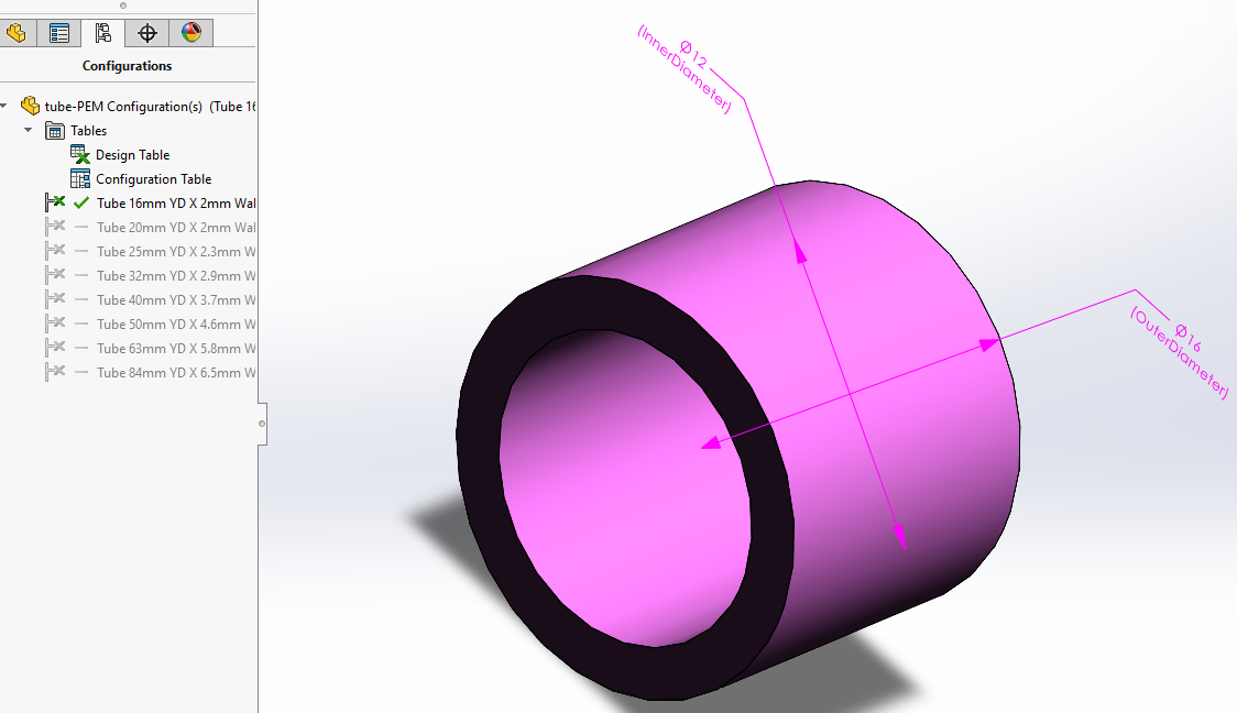 Geometrin är en enkel slangstump. Tittar vi närmare så ser vi att det finns en mängd konfigurationer av denna stump, dvs många olika dimensioner i samma part. Dessa konfigurationer är skapade och styrda från en Excel-fil i en så kallad Design Table. Designtabeller är väldigt kraftfullt för att snabbt och enkelt skapa varianter inom en part men betänk att det också gör parten prestandamässigt tyngre så ha ett gott omdöme i hur många varianter som egentligen krävs.