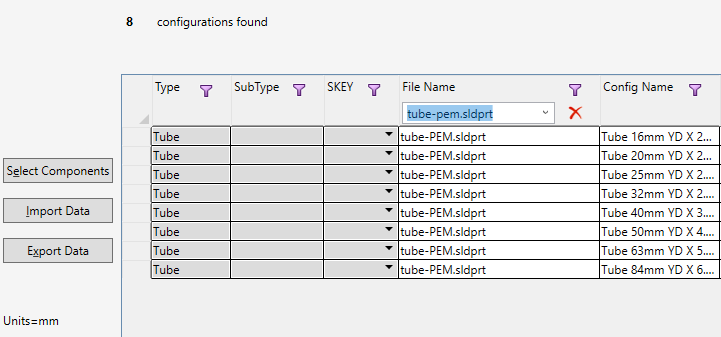 Skulle jag nu stänga excel-filen så tar SOLIDWORKS bort de 369st konfigurationerna och 8st blir kvar. Vi gör dock några fler ändringar innan vi stänger. Eftersom vi bytte enhet till millimeter så behöver vi ha våra siffror i mm. Se bild nedan gällande lämpliga värden för diametrar, godstjocklek, vikt, böjradier. Justera också namnen så att de stämmer med värdena. Hur du gör detta är upp till dina excel-kunskaper. Jag har valt att använda text-formler så att jag bara behöver justera i de gröna fälten så fylls resten i automatiskt. Gör detta på ett sätt du finner lämpligt.