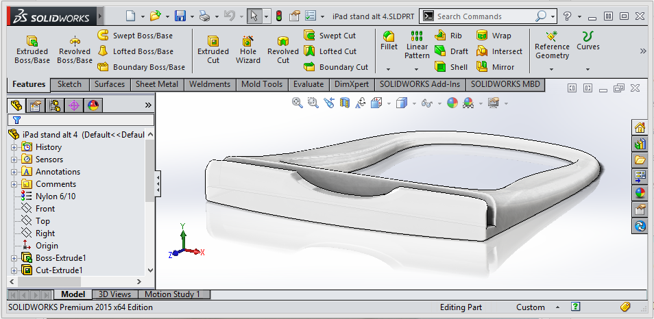 Att version två var ett stort fall framåt i mitt egna lilla produktutvecklingsprojekt var ganska tydligt. (Se hur det hela startade här…) Men, precis som vanligt märker man att det finns saker som kan bli bättre. Passformen för iPaden var nu perfekt och handen kunde enkelt hålla i det hela när man låg ner och kollade på film men det upplevdes lite vingligt eftersom kanten var så tunn. Dessutom så var det ingen lysande idé att ta bort den lilla urgröpningen eftersom det nu var svårt att få upp snabbmenyn för ljus/blåtand/rotationslås mm. Inte praktiskt alls. Så, tillbaks in i SOLIDWORKS.