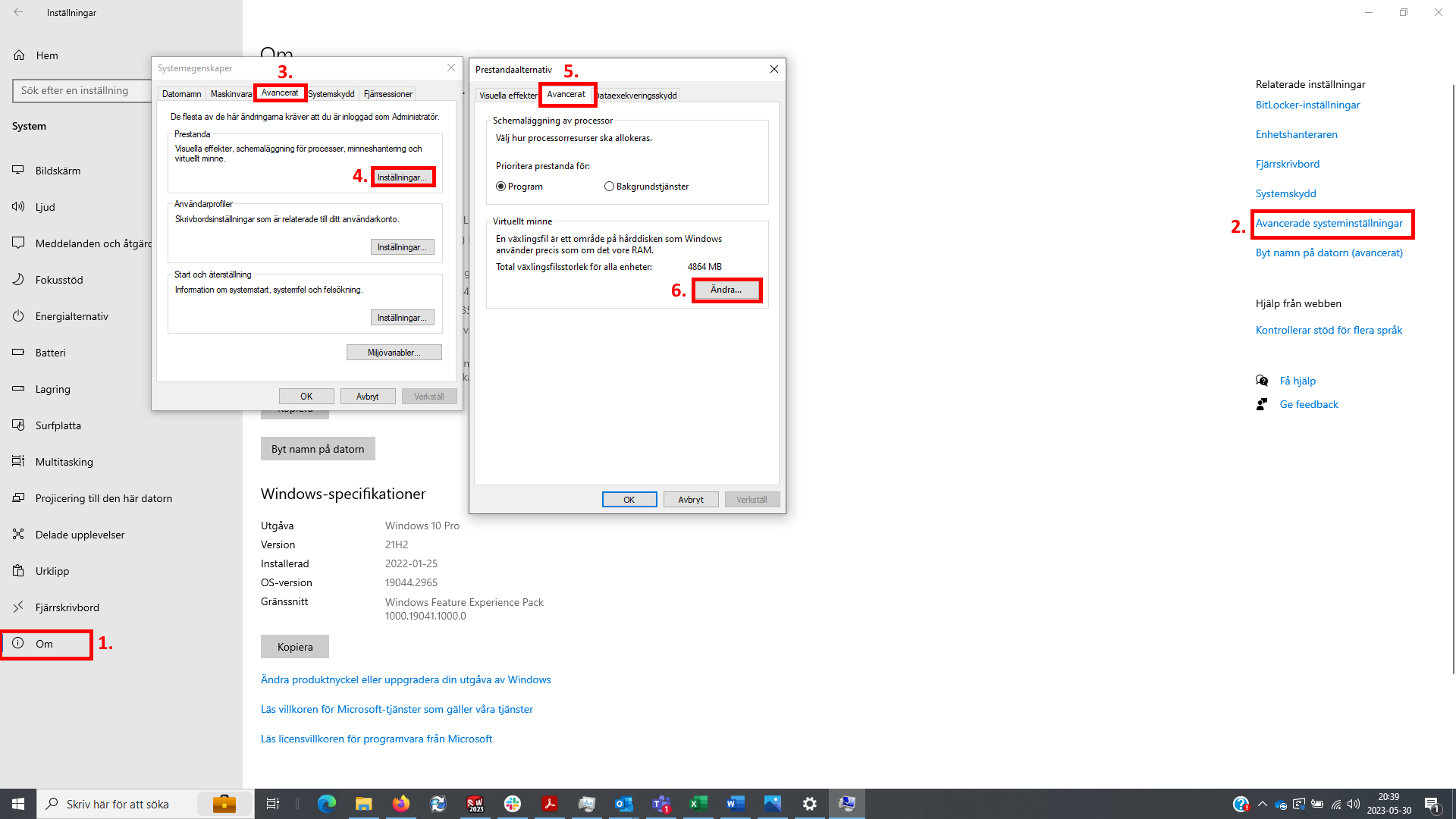 Tryck på Om(1) i vänstra menyn och tryck sedan på knappen Avancerade Systeminställningar(2) till höger. I det nya fönstret Systemegenskaper klicka på tabben Avancerat(3), klicka sedan knappen Inställningar(4). I det nya fönstret, byt till tabben Avancerat(5) och tryck till slut på knappen Ändra(6) längst ner på sidan.