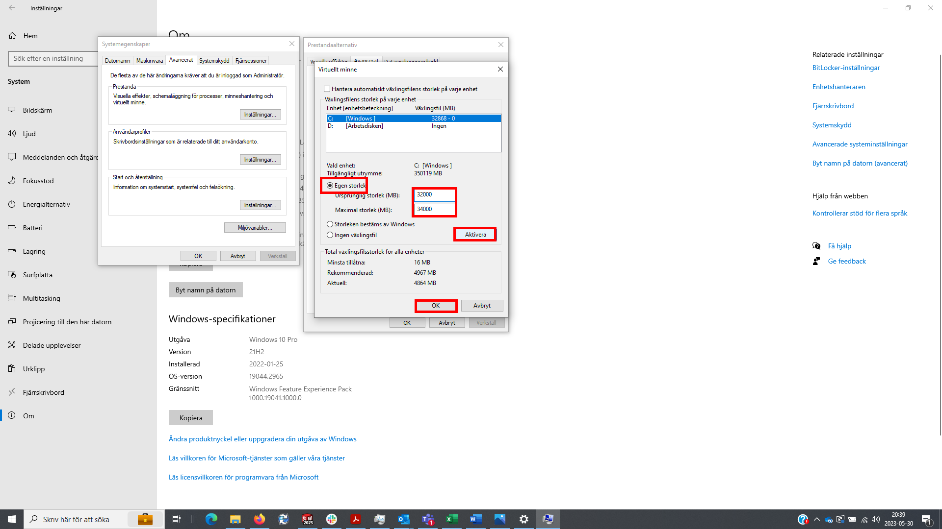 I regel vill man allokera dubbla mängden virtuellt minne kontra RAM-minne i datorn. Så I fallet att man har 16GB RAM installerat sätter skriver man in 32000-34000MB.