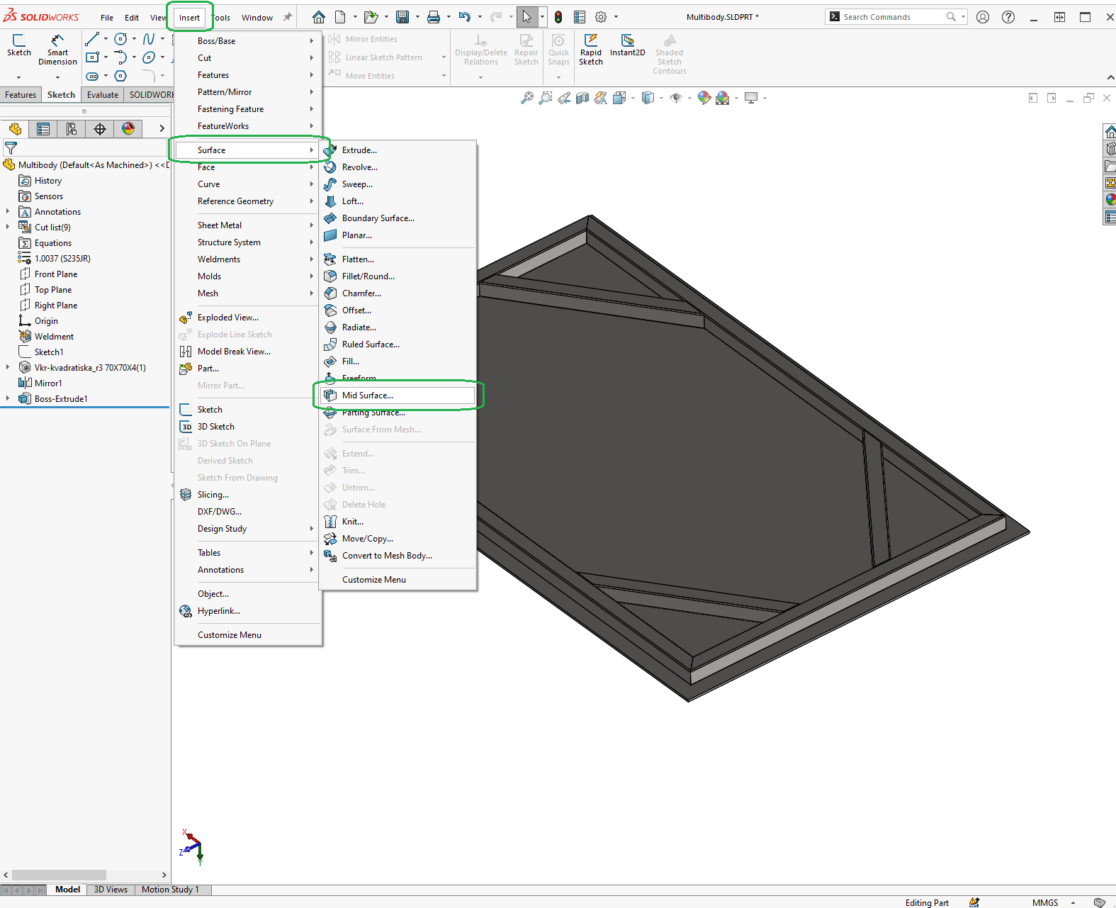 Vi börjar med var i programmet vi hittar kommandot. Gå till insert – Surface – Mid Surface i verktygsraden.