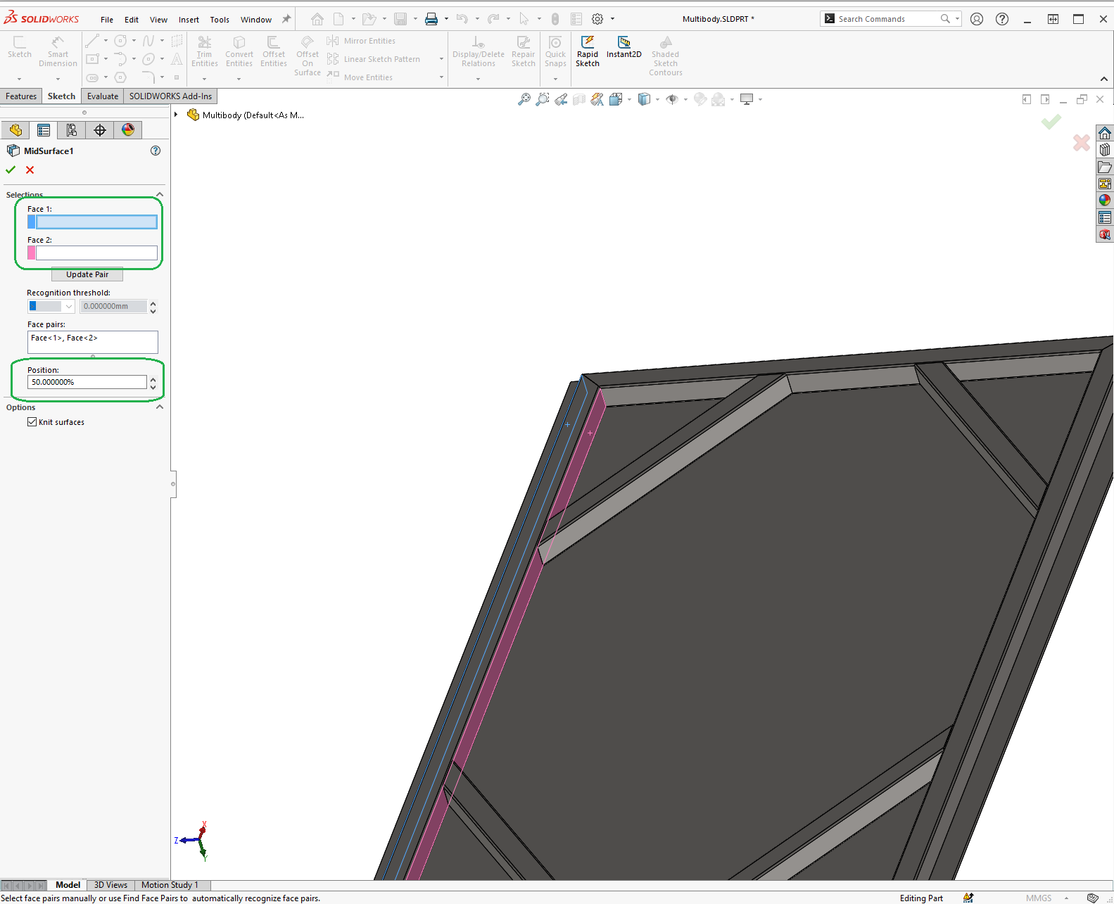 Kommandot går att använda på två sätt. Antingen kan vi manuellt markera två motstående, parallella ytor. Den enda inställning vi behöver bekymra oss om då är Position, som styr procentuellt läget på vår nya yta i relation till de valda ytorna. Då vi vill ha just en mittyta låter vi Position stå kvar på 50%.