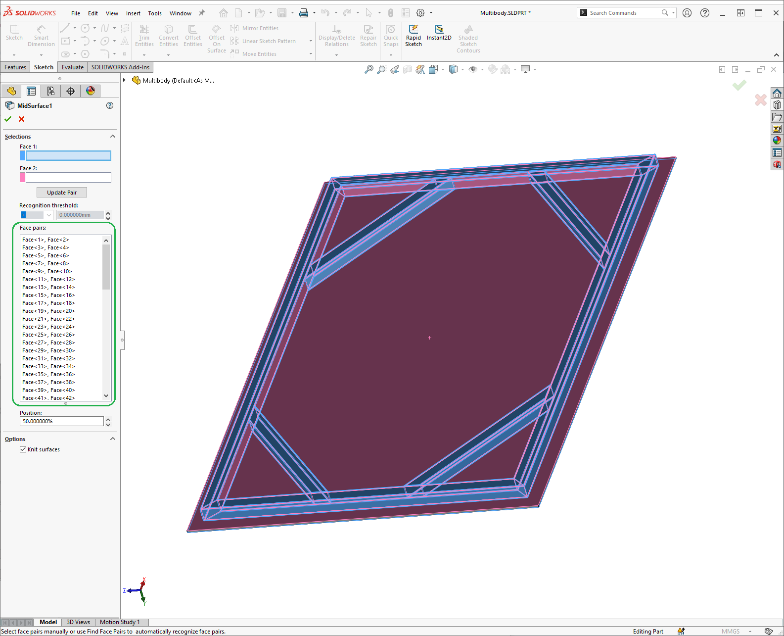 Ibland kan man vara behjälpt av att få tag i mittytorna på en eller flera solida kroppar. Ett sådant exempel skulle kunna vara när man vill förenkla en modell för att enklare kunna räkna på den med SOLIDWORKS Simulation. Till vår hjälp finns då i programmet ett kommado som gjort för just detta ändamål; Mid Surface. Idag ska vi titta lite närmare på vilka möjligheter som finns i kommandot.