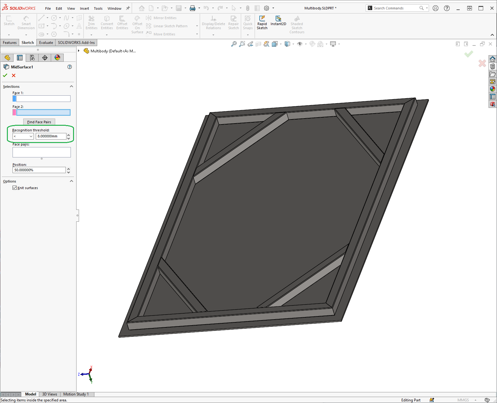 Men säg att vi vill få lite mer kontroll på processen. I vår modell är godstjockleken på balkarna 4 mm, medan godstjockleken på den stora skivan är 10 mm. Säg att jag vill få en mittyta i alla balkarna, men inte i den stora skivan. Hur åstadkommer vi det? Till det kan vi använda Recognition threshold. Sätter vi villkoret <8,0 mm kommer kommandot bara titta efter ytpar som ligger närmre än 8 mm, vilket kommer exkludera den 10 mm tjocka plattan.