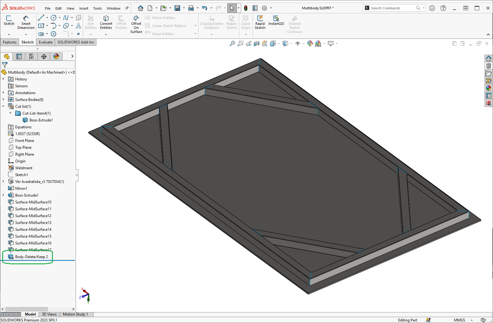 Modellen vi ska jobba med är denna. En multibody-part ritad med Weldment samt en alldeles vanlig extrudering.