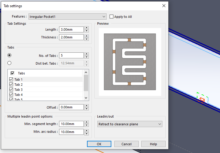 Som ni ser ovan finns det olika alternativ att styra dessa Tabs i Solidworks CAM. Vi kan justera antalet eller ange ett avstånd emellan. Justera hur verktyget ska röra sig över dom vid Leadin/out inställningen.